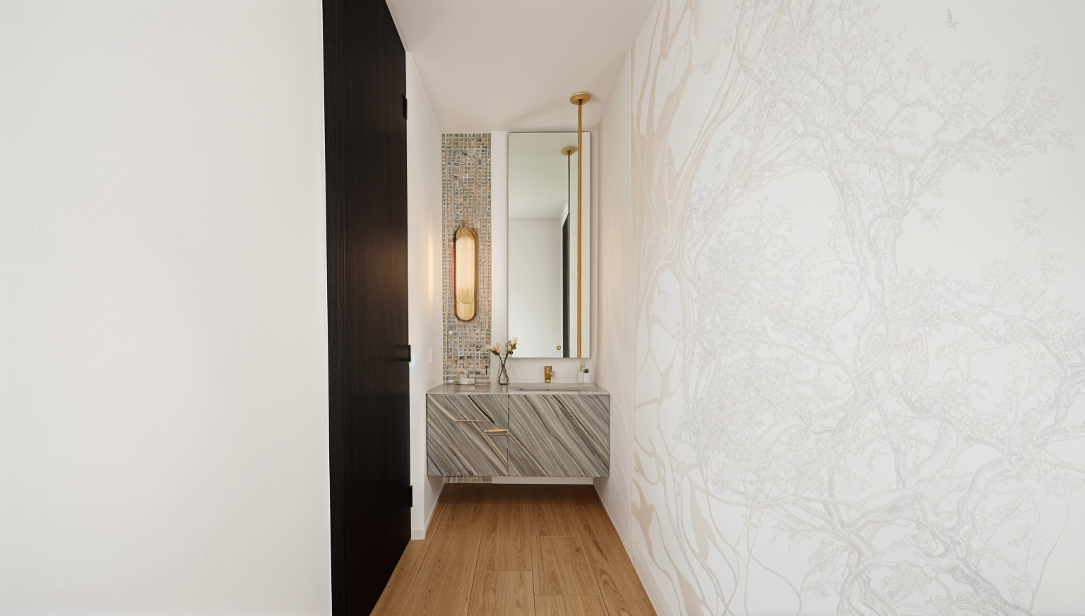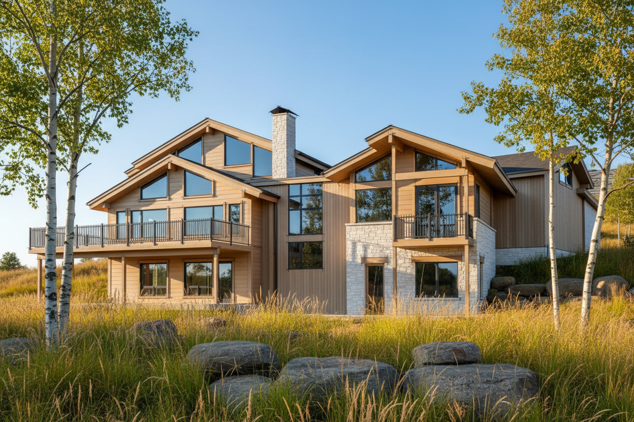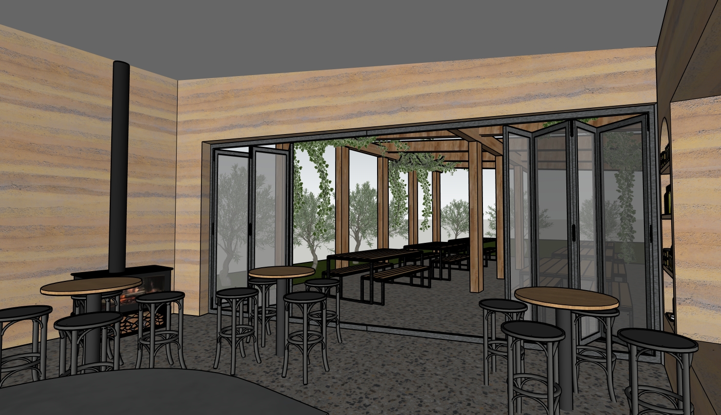 maintain original layout add three skylights to centre of back room ceilings are white plaster doorframes are black metal preserve all architecture furniture and layout exactly as shown do not redesign move or replace any objects only enhance materials and lighting