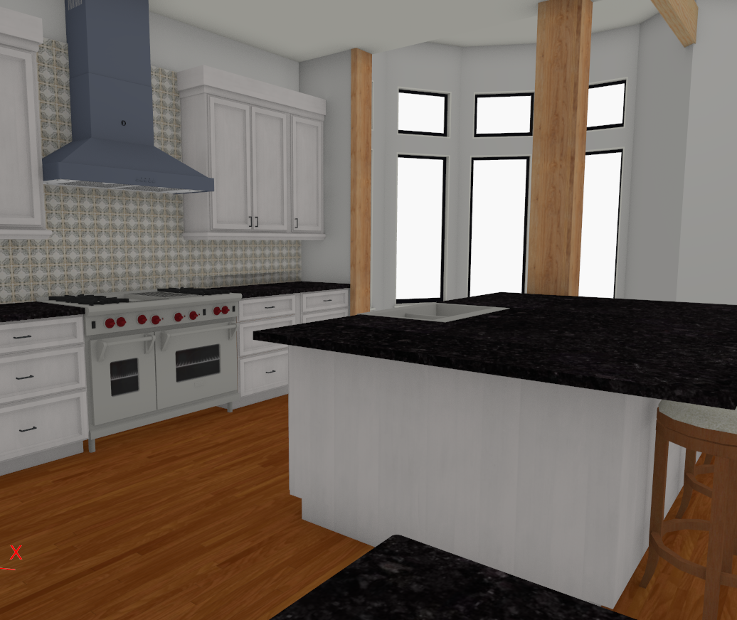 kitchen space with black and white backsplash make sure to keep black leathered countertop with 0 veining white painted cabinets stainless steel venthood aged beams