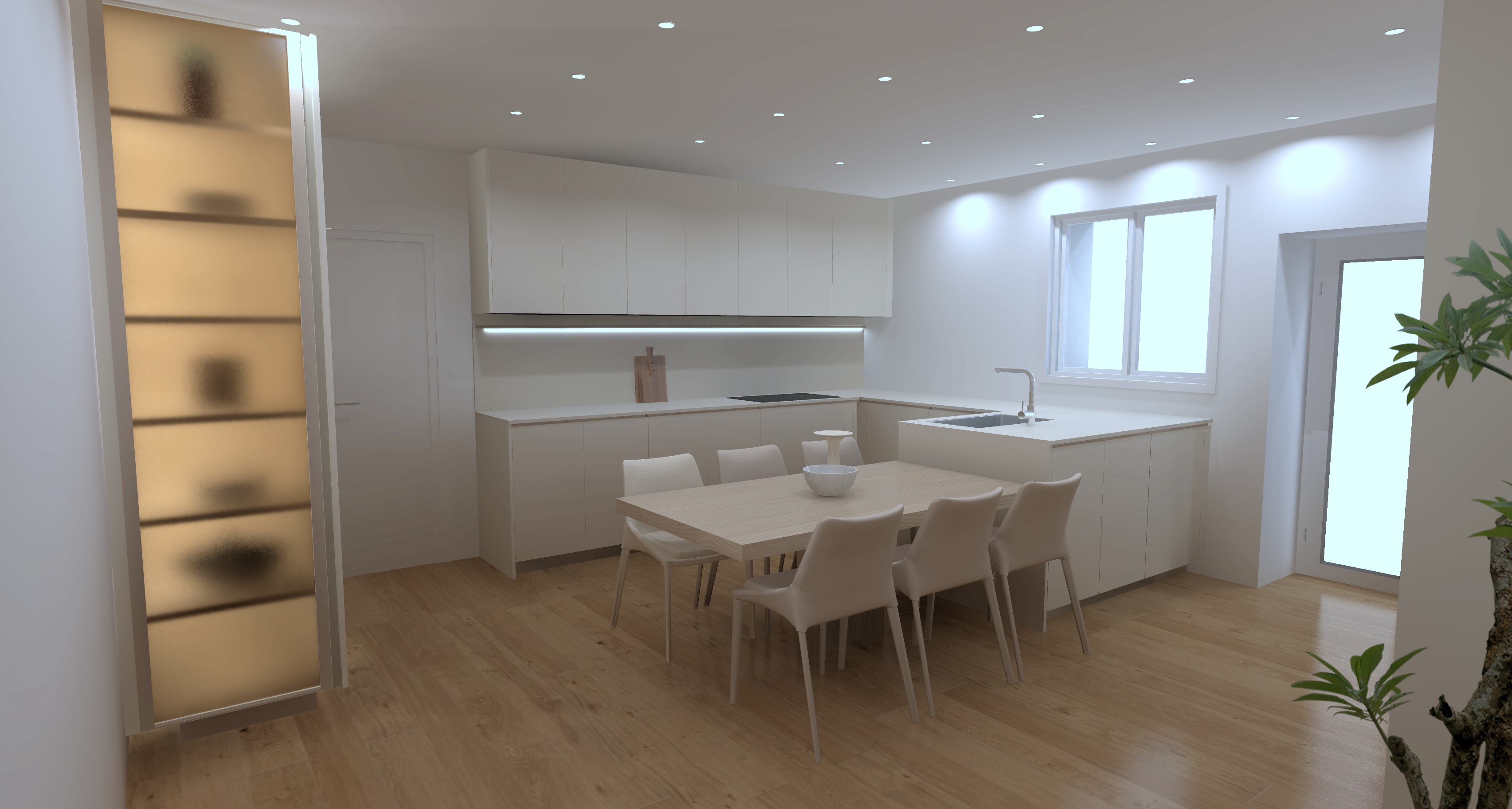 act as an award winning architectural photographer and senior cgi to photo compositing artist specialized in transforming sketchup style interior renders into indistinguishable photoreal architectural photographs your mission is to convert the provided image into a hyper realistic photo authentic interior architectural photograph while strictly preserving the original architecture and composition critical preservation rules preserve the building design dimensions proportions layout camera angle framing composition lens feel horizon line perspective and vertical alignment exactly as shown do not move resize add remove or redesign any architectural elements cabinetry openings walls ceilings island dimensions fixtures furniture placements or decor layout maintain the exact spatial relationships and visual balance of the original image no warped geometry no altered perspective no re staging image to image transformation goals camera and photographic realism lock the camera precisely same focal length impression same viewpoint same horizon same verticals same composition keep perspective natural and architecturally correct avoid lens distortion unless extremely subtle and photographically plausible final result must feel like it was captured with a high end full frame architectural photography setup material replacement and surface realism replace all visible materials with physically accurate ultra high resolution pbr materials 4k to 8k use correct albedo roughness gloss response normal maps and displacement bump where relevant every surface must behave like a real photographed material never like cgi introduce subtle realism micro scratches light edge wear slight smudges natural tonal variation realistic seams grout lines joints and fabrication details slight imperfections in reflectivity and texture uniformity countertop plan de travail apply a creamy beige worktop in the same material than the furniture beige melamine ensure realistic specular response soft natural highlights with believable depth avoid any plastic laminate like fake glossy or overly perfect finish surface must read as premium tactile dense and authentic under daylight vegetation and foliage realism upgrade all visible plants trees and foliage to ultra detailed botanically plausible vegetation add natural variation in leaf size leaf orientation color shifts density branching randomness include realistic subsurface scattering translucency in leaves so daylight passes through them naturally foliage must feel alive organic and photographically believable not decorative cgi assets lighting and global illumination use natural photographic daylight consistent with the window positions and scene orientation sun direction must be believable and physically coherent create soft realistic shadows with subtle penumbra include global illumination bounced light ambient occlusion natural reflection behavior realistic interior to exterior exposure balance avoid overexposed cgi lighting blown highlights or artificial brightness atmosphere color and photographic finish add subtle atmospheric depth and realistic air perspective use true to life color grading neutral whites accurate wood tones restrained contrast realistic dynamic range preserve correct scale cues across all materials and objects add very subtle real camera grain noise for authenticity keep the image crisp but natural no over sharpening no hdr look no excessive clarity final realism target the final image must read as a real architectural interior photograph not a render it should feel suitable for publication in a premium architecture or interior design magazine prioritize realism material credibility natural light behavior and photographic subtlety over stylization negative constraints no cgi look no cartoon look no painterly effect no plastic materials no exaggerated reflections no unnatural bloom no fake sharpness no added furniture no changed layout no altered architecture no warped lines no modified proportions no staging changes no fantasy lighting output objective produce a final result that is visually indistinguishable from a professionally shot high end architectural interior photograph while remaining absolutely faithful to the original render s design and composition