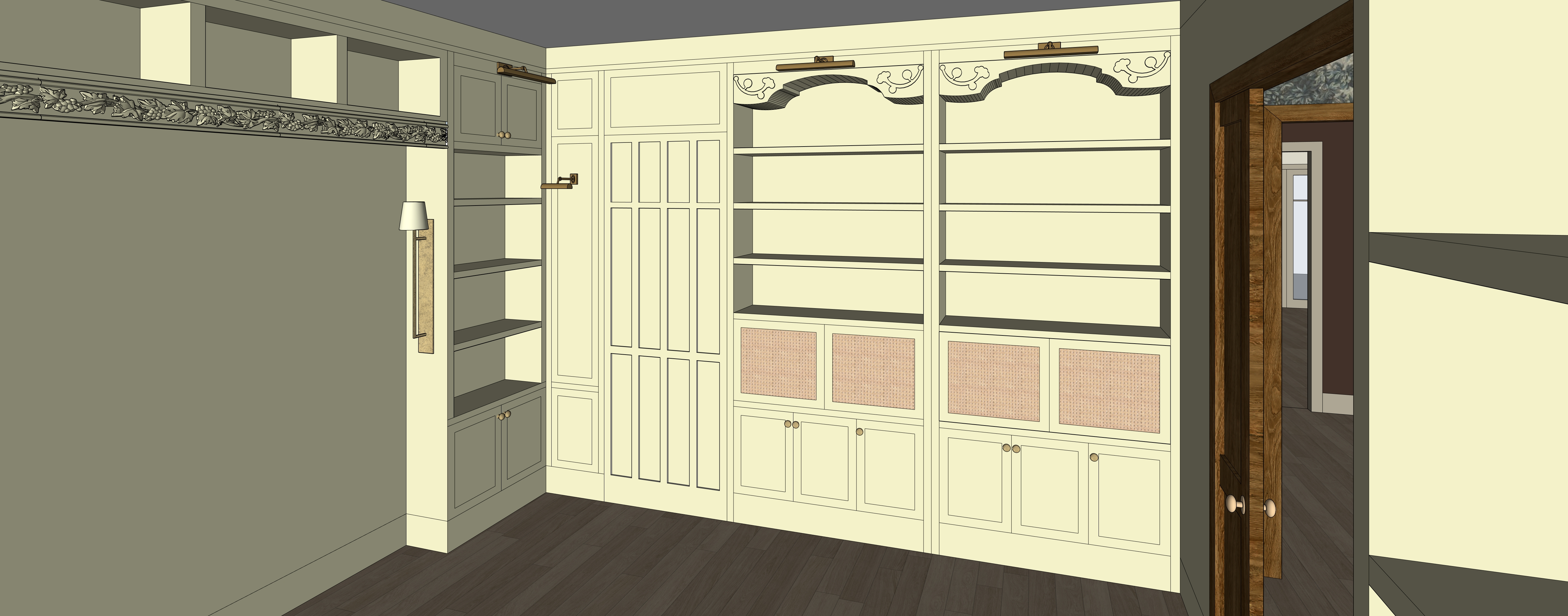 photorealistic traditional built in sitting room rendering prompt create a highly photorealistic interior rendering of a traditional built in sitting room wall using the provided reference image as a fixed architectural model the layout cabinetry proportions shelving window placement trim curtain locations lighting fixture placement and camera perspective must remain exactly as shown do not redesign reposition or reinterpret any architectural elements this rendering is focused on finishes and architectural detailing do not add furniture the space should feel refined warm layered and high end like a magazine quality custom home interior with depth and character architecture to preserve exactly full built in cabinetry wall with central opening tv or focal wall upper cabinets and open shelving configuration lower cabinets and drawer alignment decorative trim band across upper section wall mounted sconces flanking the central opening picture light above cabinetry window placement and proportions on left wall curtain placement and scale trim profiles casing details and baseboards floor direction and layout do not alter proportions spacing or add remove cabinetry materials and finishes cabinetry critical paint color benjamin moore dune grass muted beige tone with tinge of yellow green matte to soft satin finish subtle brush or sprayed enamel texture not flat not glossy panel detailing should have soft shadow depth interior of shelving slight tonal variation of the same color or a subtly warmer complementary tone for depth wood elements white oak light tone no knots or distressing low sheen slightly worn finish trim casings painted to match cabinetry tone or slightly lighter complementary neutral soft depth and shadowing at profiles hardware fixtures aged brass or antique brass warm patina not polished includes knobs pulls sconces and picture light lighting use layered realistic architectural lighting soft daylight entering through windows on the left subtle greenery visible outside windows even ambient light across cabinetry sconces very soft diffused glow no hotspots or harsh halos on wall light should gently wash the wall not create bright circles picture light extremely subtle diffused barely perceptible no visible hotspot or bright strip no dramatic contrast no over dark areas lighting temperature 3200 3600k warm neutral camera settings eye level 5 ft height 28 35mm architectural interior lens maintain exact perspective and framing high dynamic range ultra high resolution 4k 8k styling minimal keep shelves mostly empty or very lightly styled a few books or small objects only if needed for realism no clutter no furniture rendering style professional architectural interior photography focused on finishes warm slightly moody serene balanced exposure not too bright not dark materials feel tactile layered and realistic avoid glossy finishes avoid flat lighting avoid builder grade look geometry guardrail critical treat the reference image as a fixed 3d model do not change cabinetry layout do not move shelving or sconces do not alter window placement do not change camera angle do not add furniture enhance materials lighting and realism only
