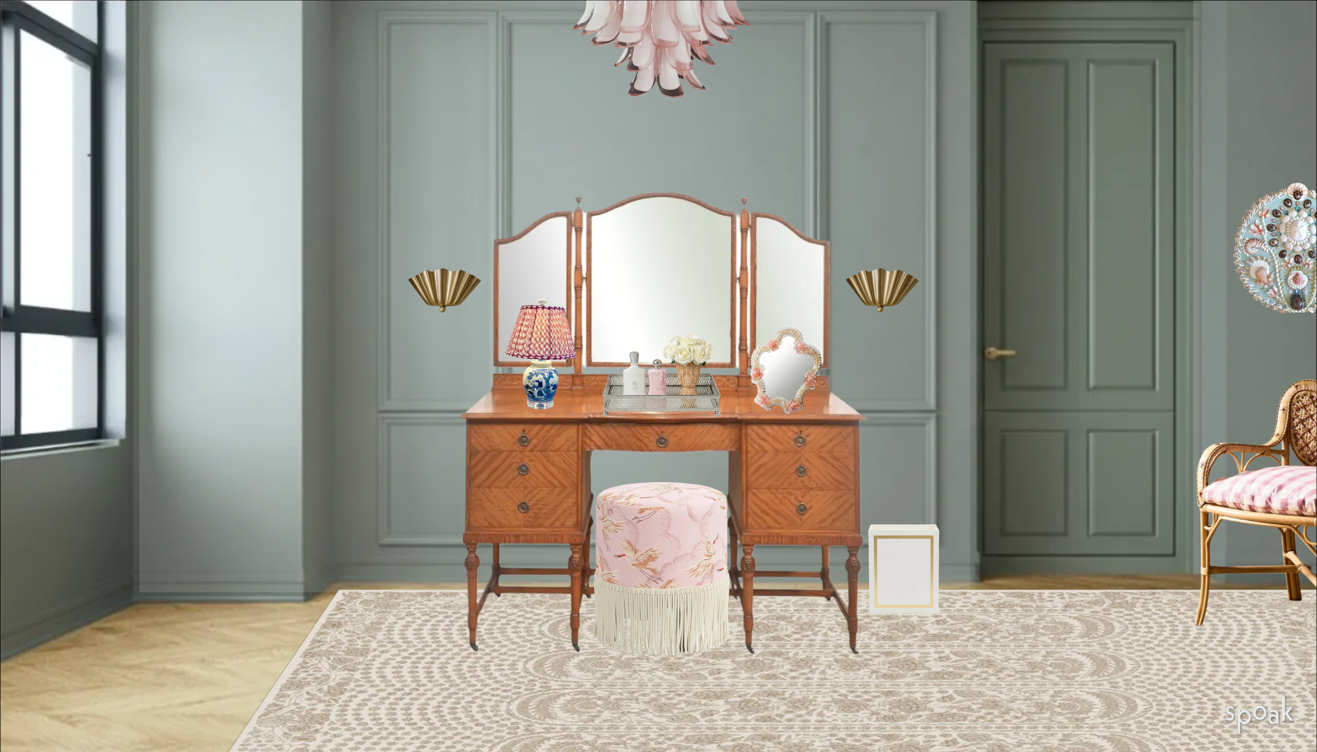 architectural interior photography enhancement only preserve the exact composition geometry object placement proportions scale surface patterns artwork and product details exactly as provided all furniture and objects are real items for sale and must remain visually identical to the input image do not redesign restyle reinterpret replace remove add or modify any objects do not alter wallpaper pattern fabric prints stool pattern alignment perfume bottle labels lamp details mirror detailing hardware or color accuracy maintain exact color integrity and pattern alignment enhance realism only through natural directional window lighting soft physically accurate shadow falloff subtle ambient occlusion where objects meet surfaces realistic fabric gravity without shifting or distorting patterns true to life material rendering linen cotton wood grain marble veining glass brass accurate optical mirror reflection of the adjacent wall based on correct perspective apply a high resolution architectural digest editorial photography finish balanced dynamic range crisp edge clarity natural contrast clean highlight control no stylization this is a lighting and material realism enhancement pass only no generative redesign no reinterpretation no object modification
