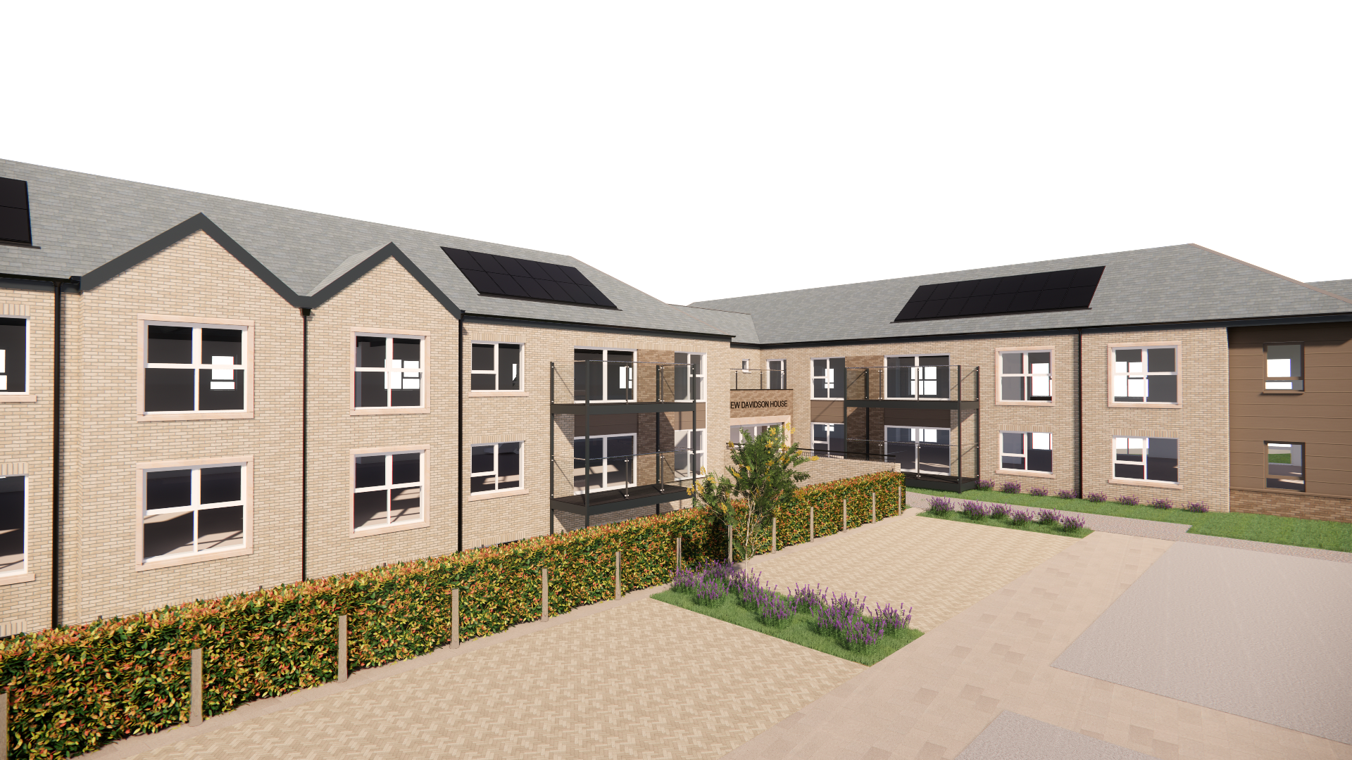 make this render realisitc and enhance it add sky with few clouds slightly warm sun add some soft planting on grass areas make grass realistic add trees to background keep materials the same cream buff common brick where shown beige grey 74685b horizontal standing seam metal cladding where shown solider cream buff common brick where shown cream sandstone widow cills and surrounds where shown grey modern slate roof tiles redish beige bricks where shown solar panels are shown on roof only show grass on right infront of building