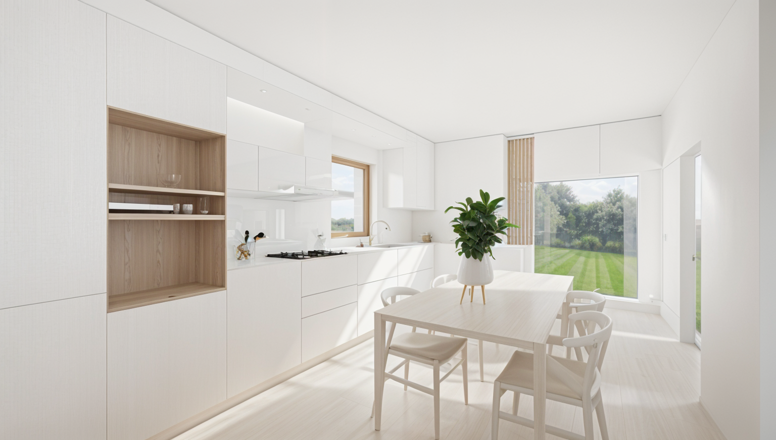 ultra realistic photorealistic render keep absolutely all geometry proportions furniture placement and windows exactly as in the 3d model do not change replace or reinterpret any part of the modeling windows located in the corner of the room render them as clear transparent glass with white frames show a blurred garden through the glass sunlight must enter through the windows creating natural warm light and realistic shadows inside materials use the exact materials from the 3d model glossy handcrafted zellige tiles backsplash with slight irregularities light gray travertine countertop with subtle veining natural wood flooring with warm grain details lighting natural daylight enhanced with sunlight entering from the windows adding warmth and contrast combined with integrated ceiling spotlights with realistic led glow style magazine style architectural photography ultra hd tactile materials elegant and contemporary