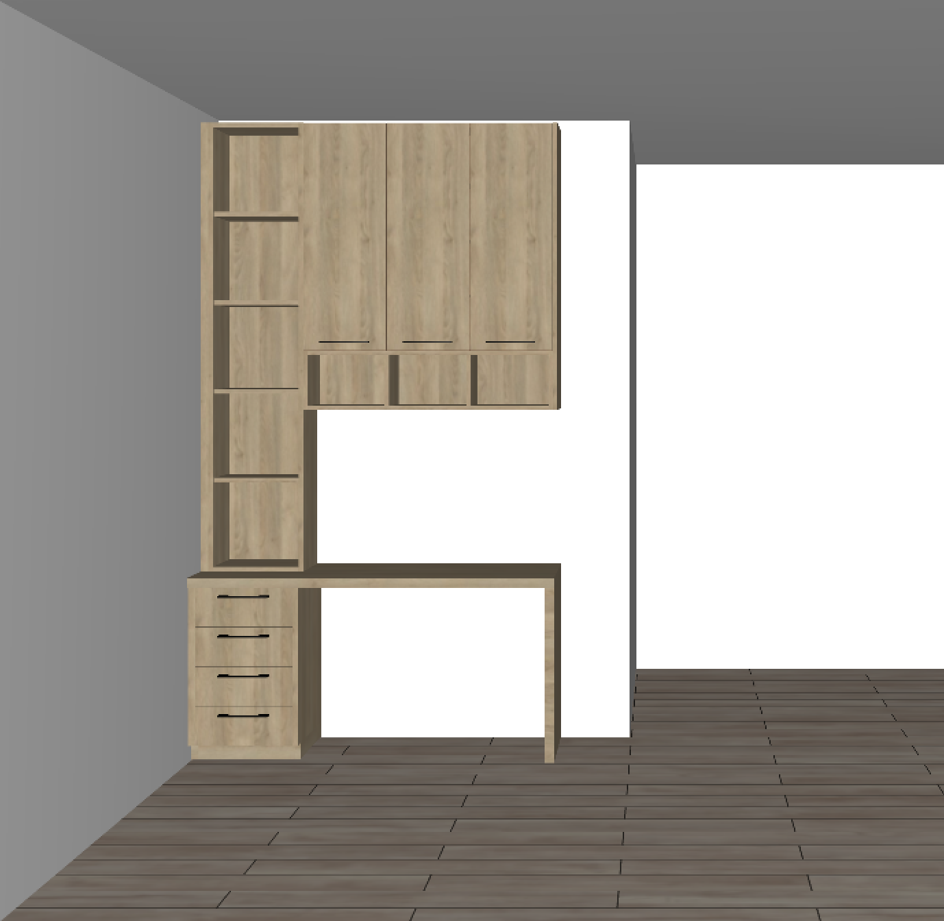 modern minimalist kitchen interior sleek beige cabinetry with integrated stainless steel ovens adjacent to dark wood open shelving a luxurious white marble countertop with subtle gray veining sits on a natural wood base creating a warm contrast light gray walls and ceiling harmonize with a large white accent wall providing an open airy feel the room features wide gray tiled flooring that complements the neutral palette soft natural light filters through large glass sliding doors enriching the calming and sophisticated atmosphere