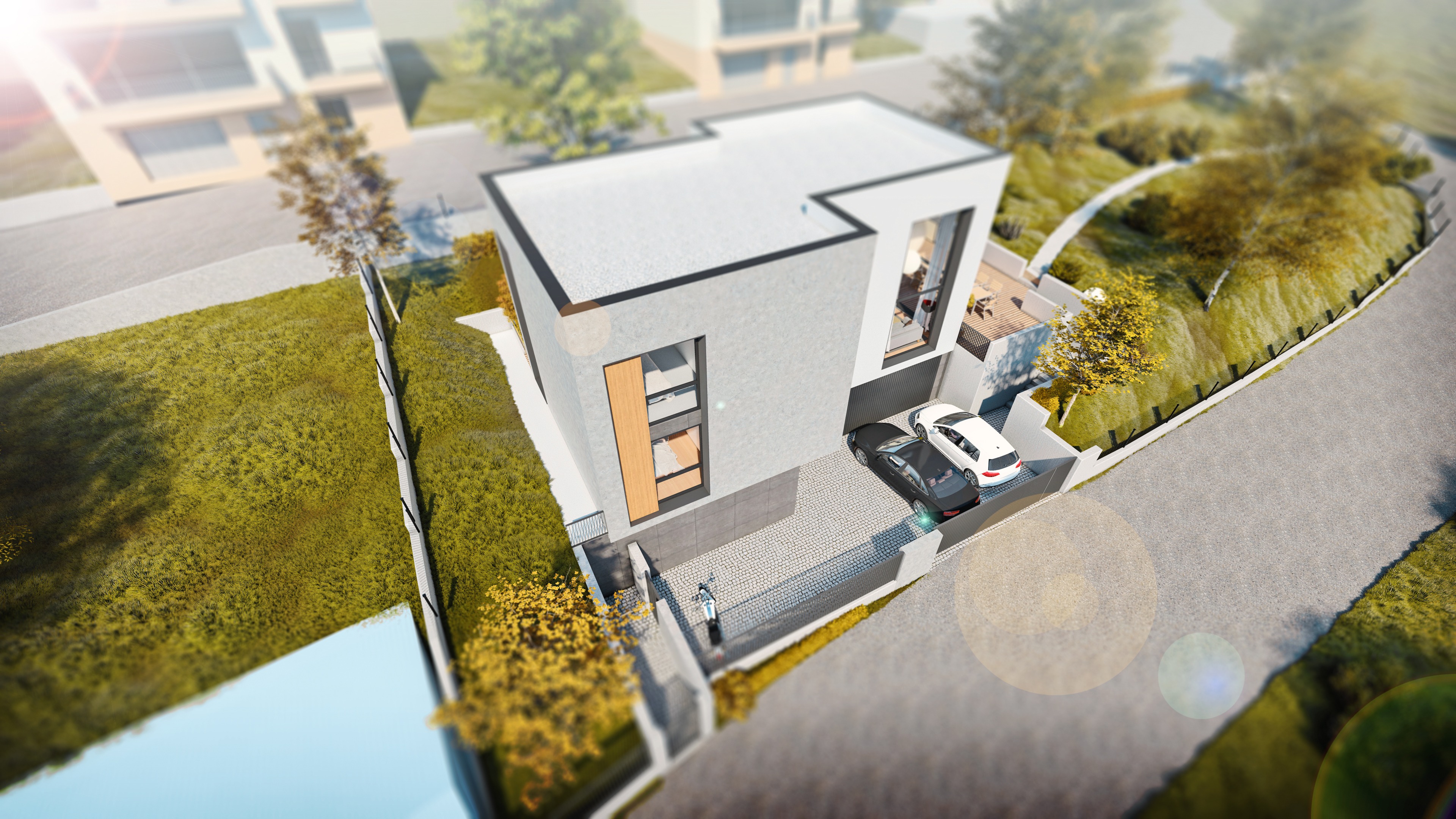 important preserve the existing geometry and the existing context exactly as provided do not modify alter reinterpret add remove scale or reshape any geometry do not change the site surroundings street layout neighboring buildings vegetation or context elements do not modify geometry scale proportions buildings road layout sidewalks or surrounding context in any way do not change text photorealistic architectural rendering clean and balanced contrast calm cinematic mood style contemporary european residential architecture minimalist premium understated do not alter the church color soft overcast noon atmosphere diffused natural daylight with subtle blue grey tones cinematic architectural mood large glass surfaces with realistic reflections soft mirror effect subtle environmental reflections of sky and surroundings wet pavement with smooth reflective surface soft light bounce and blurred reflections high dynamic range lighting realistic global illumination soft shadows calm and minimalist nordic mood photorealistic architectural visualization balanced exposure no harsh highlights add interior warm lightdo not add windowsdo not add windowsdo not change the materialskeep the wall on the ground floor remove the wet pavement do not change the wood on the facade remove the people remove the wed pavement remove the wet roof