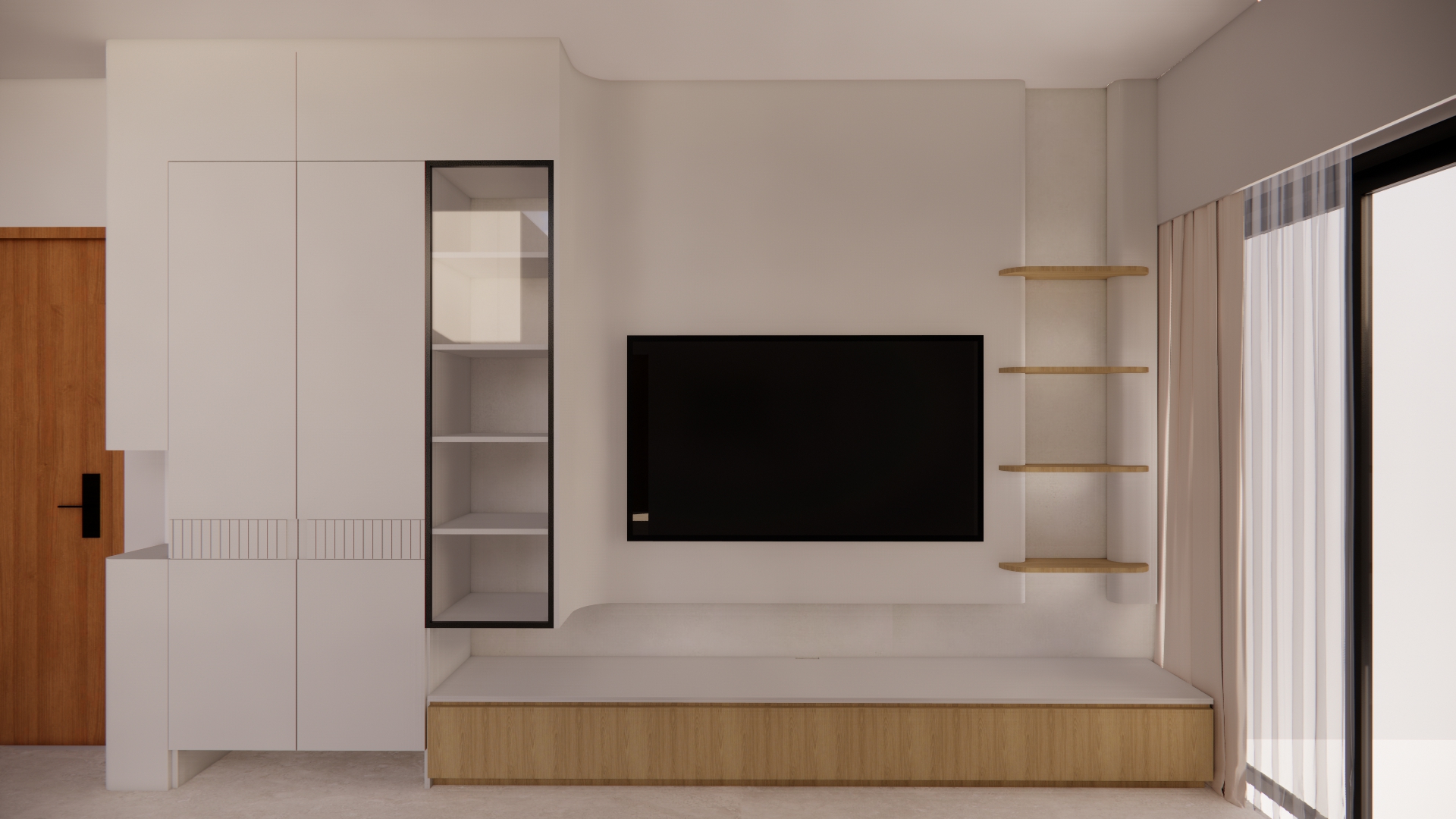 modern minimalist with natural lighting add striplight under tv wall add striplight vertical behind right side shelves add vertical striplight behind shelves behind the left side glass door add robot vacuum under the left side cabinet add minimalist accessories strictly retain colors