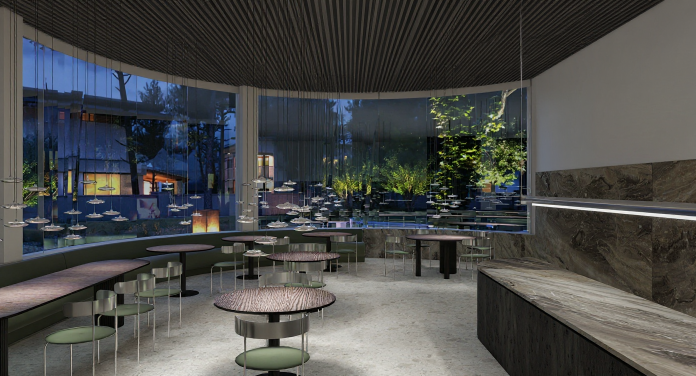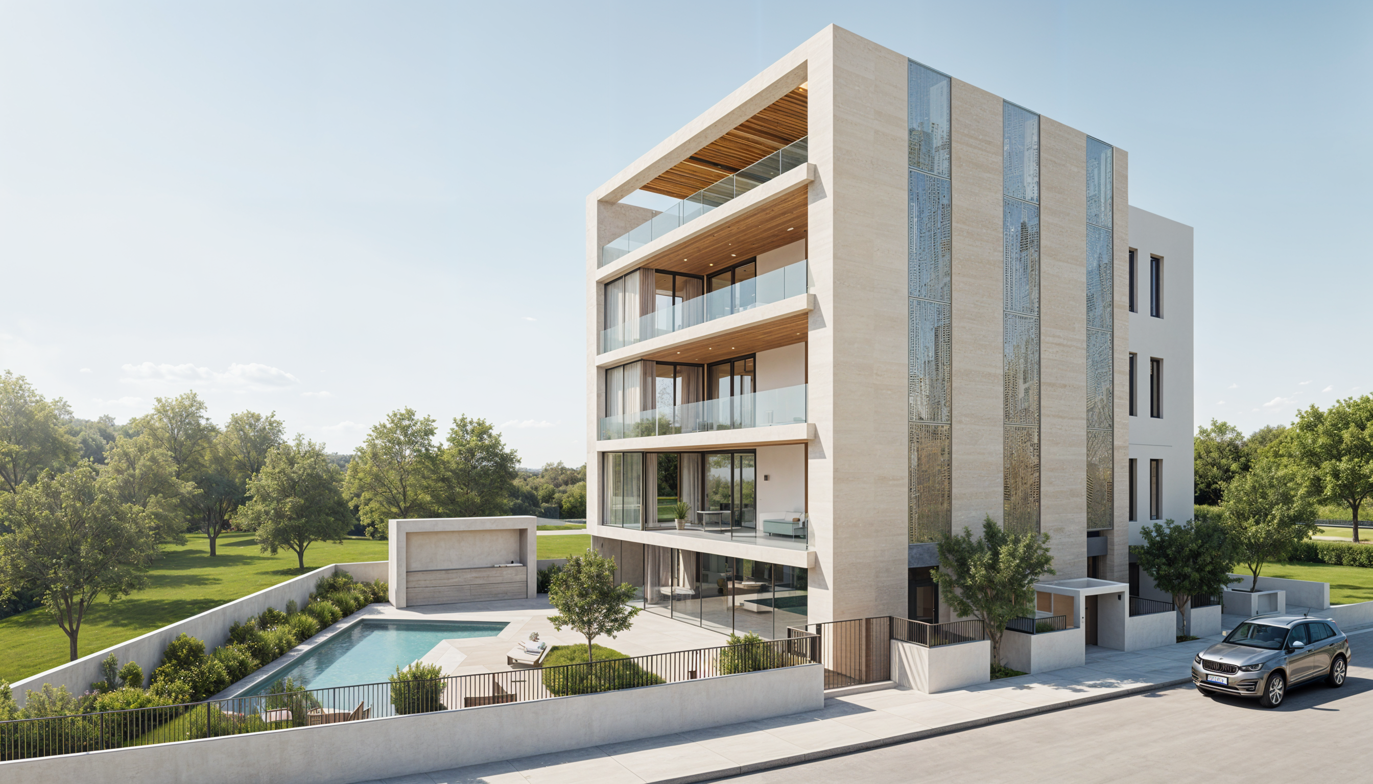 do not change anything in the image except adding people task add exactly the following people into the scene 2 people on the balconies place them naturally in soft colors 1 person near the pool area 1 person near the road in the lower part of the image people requirements all people must be very subtle delicate and not dominant use soft neutral colors so they blend naturally with the scene their scale must be proportional to the architecture for correct scale reference the range rover in the image is approximately 1 7 m tall ensure all people match realistic lighting and perspective restrictions do not change building geometry materials or textures reflections or glass stone plaster metal wood pool pavement landscaping cars road fences trees plants lighting shadows color grading sky background composition camera angle absolutely no changes to anything except adding the four people described above