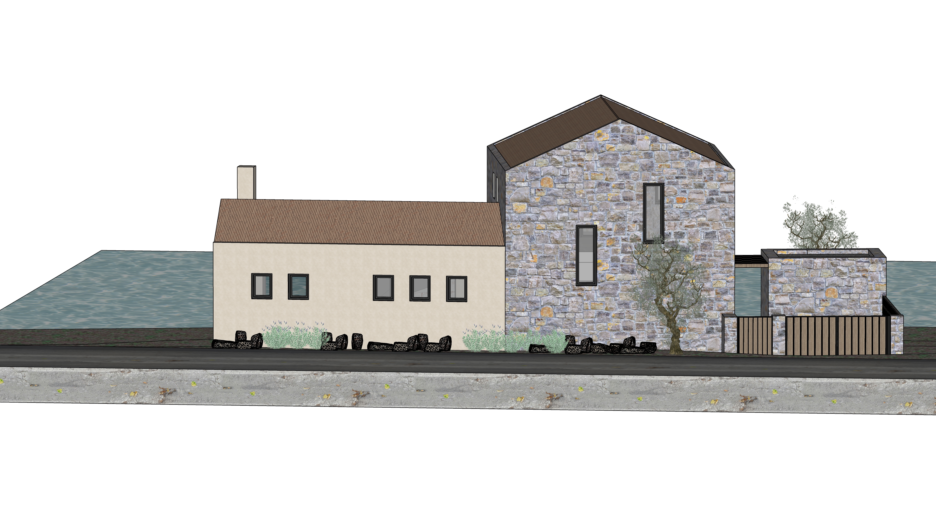 main prompt this is a house in thassos island by the sea the 2 storey volume is made of grey stone and the ground volume is plaster in cream tone the window frames are dark grey the entrance gate on the right side of the plot is medium oak wood in front of the house is a main road both volumes have a clay tile roof negative prompt do not change materials do not change geometry