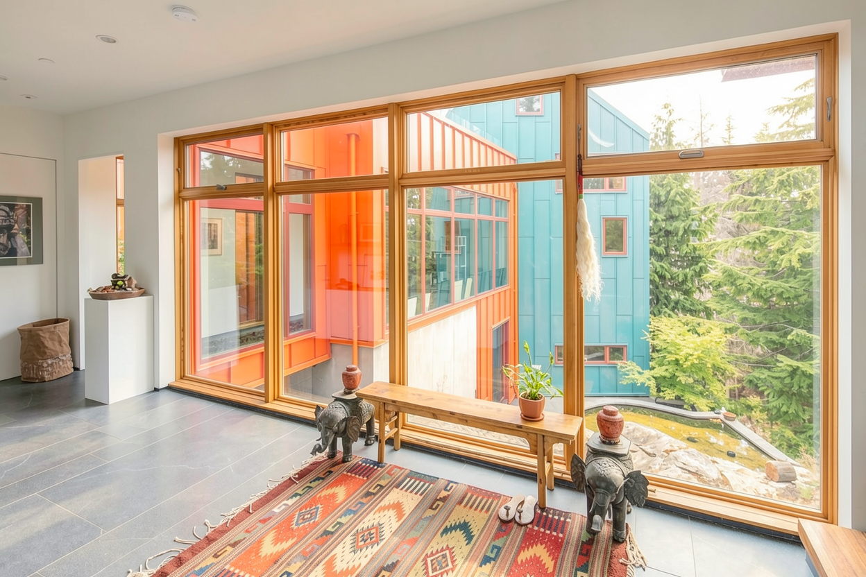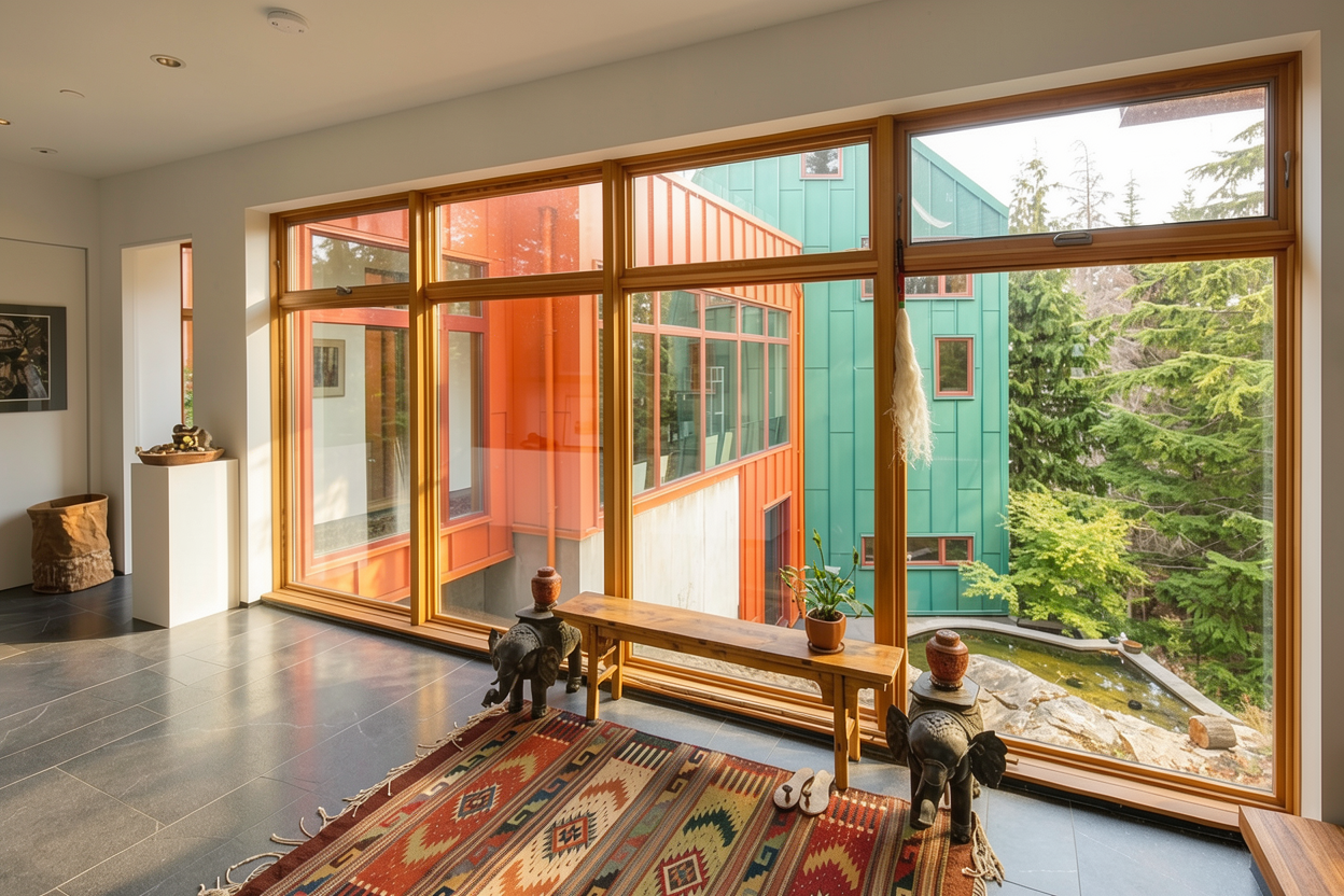 create a render in hyper realistic architectural visualization quality 8k resolution all objects furniture sanitary ware and architectural features must remain in place do not add any objects or delete anything from the image the spatial configuration must remain unchanged warmth gentle reflections soft shadows enhanced color richness and luxurious level realism improve depth and realism through wood grain richness brass highlights fabric texture and polished clarity while keeping the entire scene off white paint on walls white oak floors