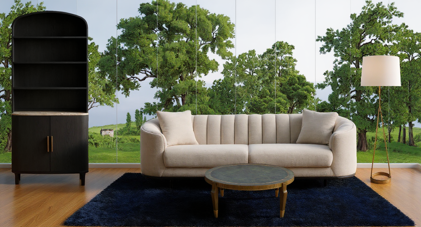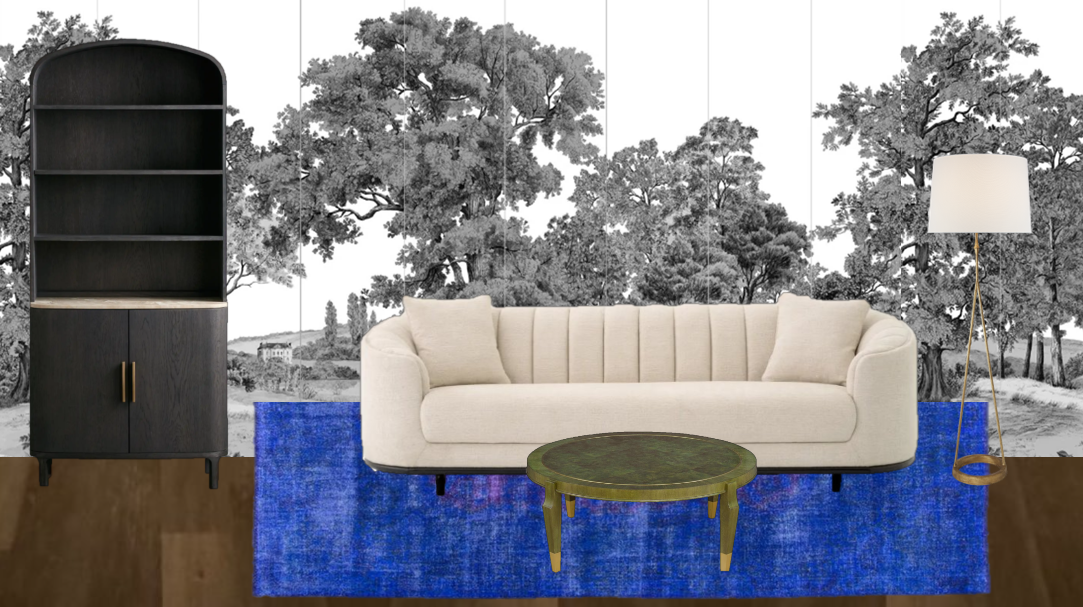 create a render make the rug a bright cobalt blue and rectangle make the baseboard height 8 inches make the background color black and white make the coffee table olive green stain