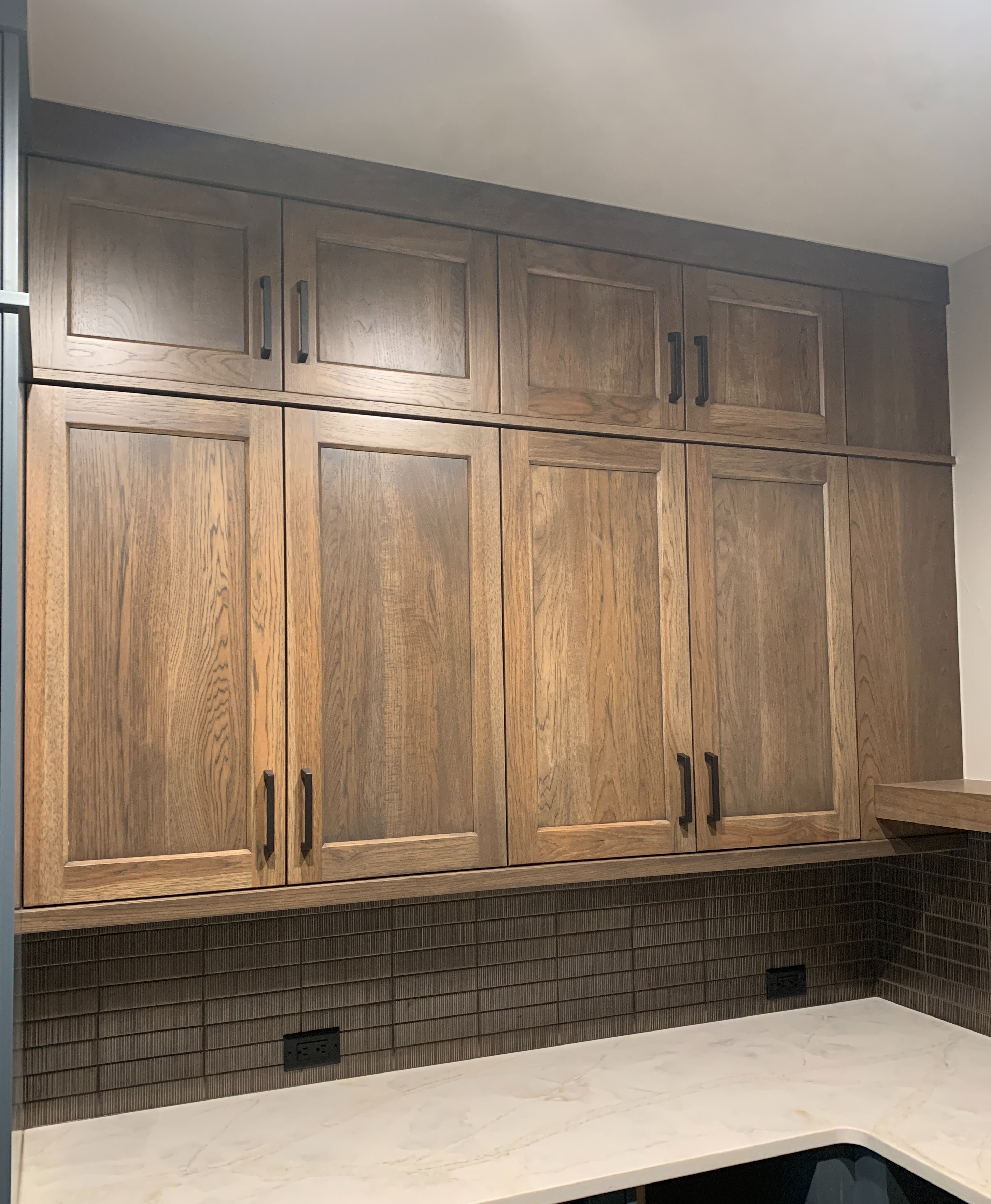 do not change the cabinets in any way preserve the exact cabinet colors materials finishes dimensions door and drawer styles hardware spacing alignment and all geometry exactly as shown do not alter the countertop shape backsplash appliances flooring lighting fixtures or wall structure only remove the construction materials clutter and mess from the scene clean the room and make it look finished and staged add a few simple tasteful home accessories appropriate for the style of the space but do not add or remove any furniture windows or architectural elements maintain the original lighting direction and realism enhance clarity and polish the photo while keeping the cabinetry and room design completely unchanged do not alter the lighting to keep the cabinet colors as they are in the image stage the countertop for a pantry