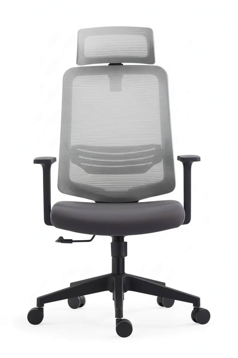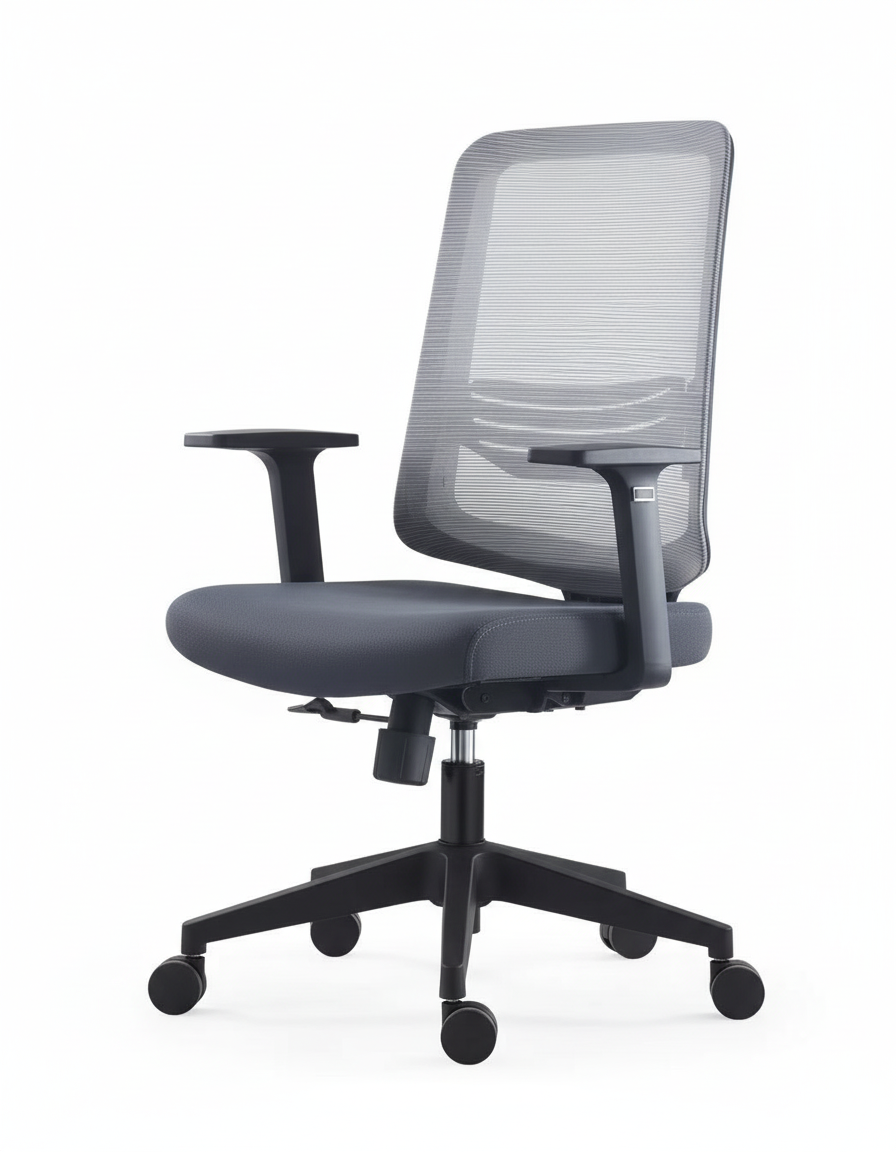 contemporary office chair in modern workspace setting gray mesh backrest charcoal fabric seat positioned at minimalist wooden desk with laptop potted monstera plant natural daylight from window concrete wall background cozy professional atmosphere lifestyle product photography shallow depth of field warm neutral tones authentic office environment 8k