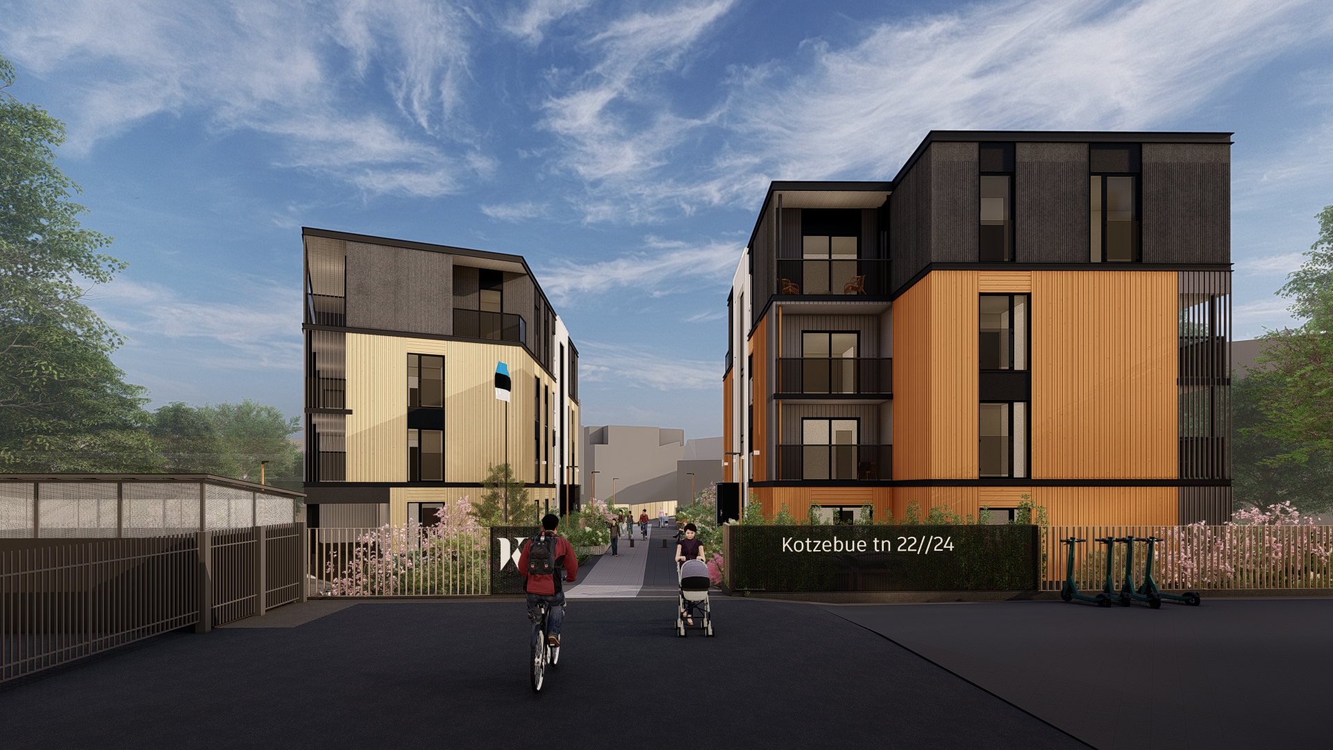photorealistic architectural photograph captured at 2 pm on a cloudy day sunlight beams from the left side soft lighting keep the massing and facade materials layout keep the original facade material placement and color palette keep the saturation of the orange and yellow colors the vegetation is nordic garden style keep the amount and massing of the vegetation dont add extra vegetation