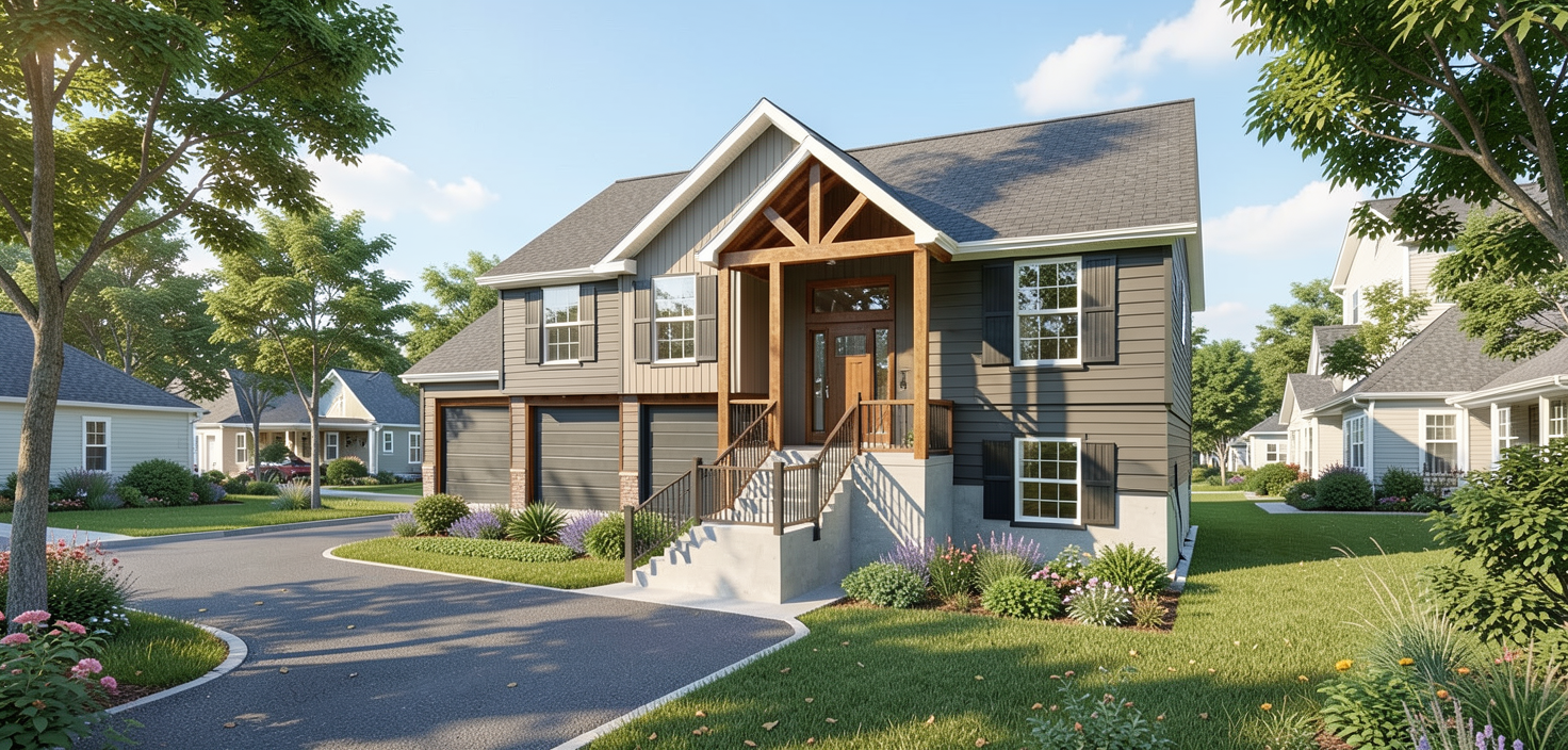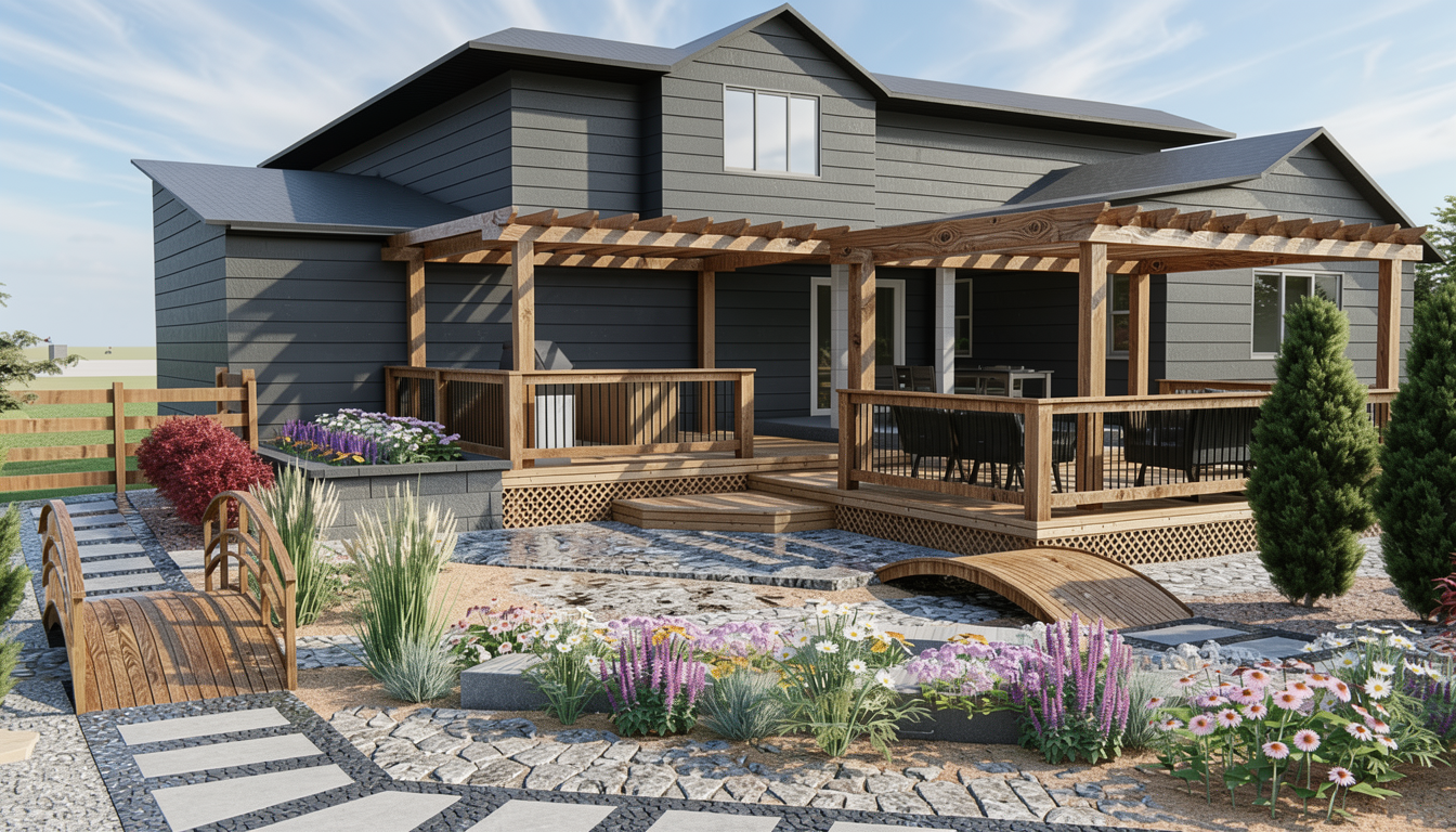 make this rendering look photo realistic with a view mountains and flowers on the table
