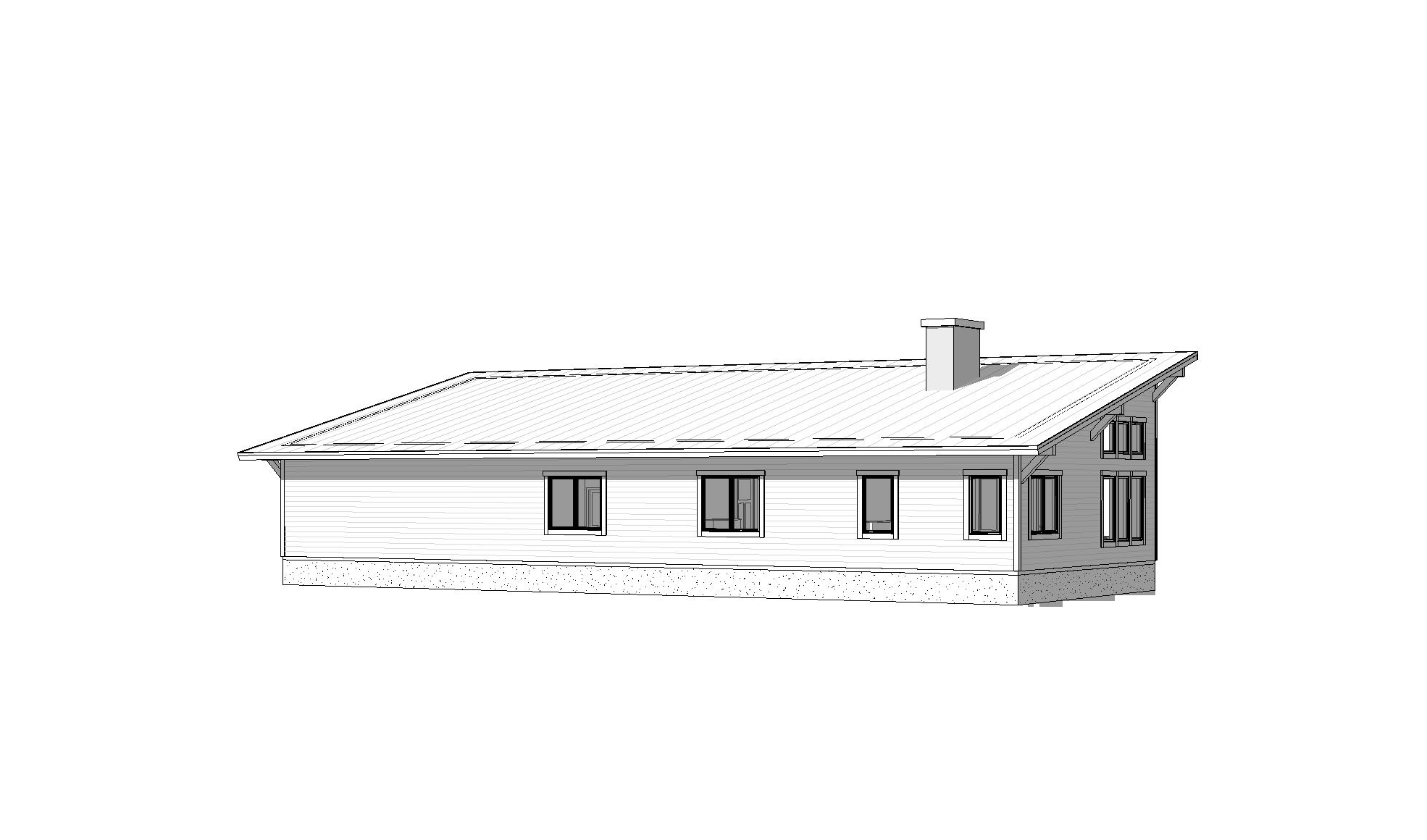 clean modern barndominium architectural exterior home rendered in cinematic vibrant daylight lighting with blue skies and sparse clouds barndominium in a lush beautiful neighborhood setting with green grass and trees surrounding the property warm glow and reflections off of the windows select grade vertical white hardie siding green manicured landscape around structure with gardens and patches of grass black standing seam metal roof high fidelity photorealistic visualization crisp shadow falloff refined facade geometry soft atmospheric depth premium architectural photography mood ultra clean composition and materials photorealistic render black trim around the windows and doors prominent trees scattered around the property hide concrete footings black window trim