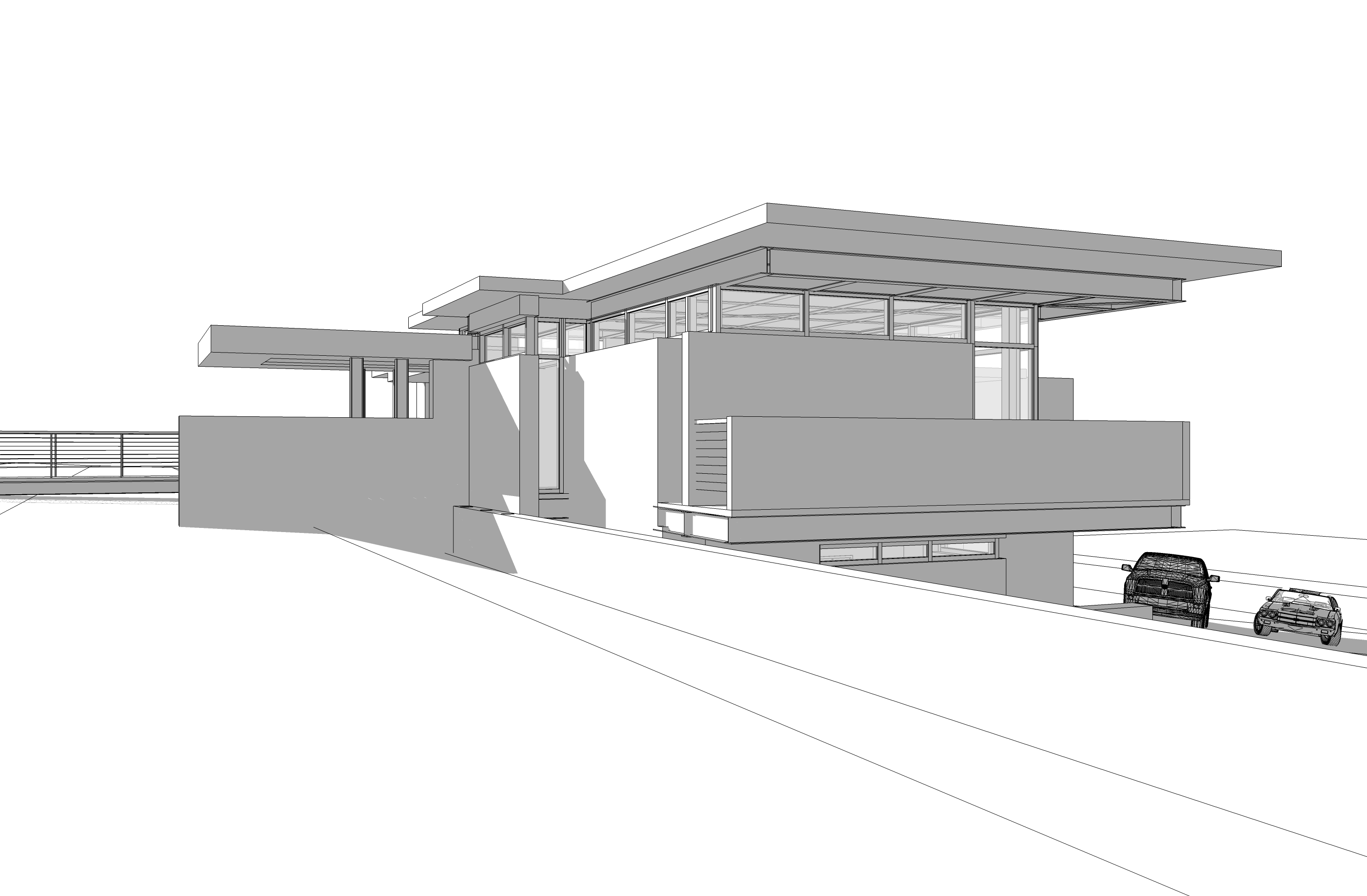 corten steel panels rustic wood shiplap siding concrete accent walls sunlight on building face tall grass in foreground fog matte black car fog dusk