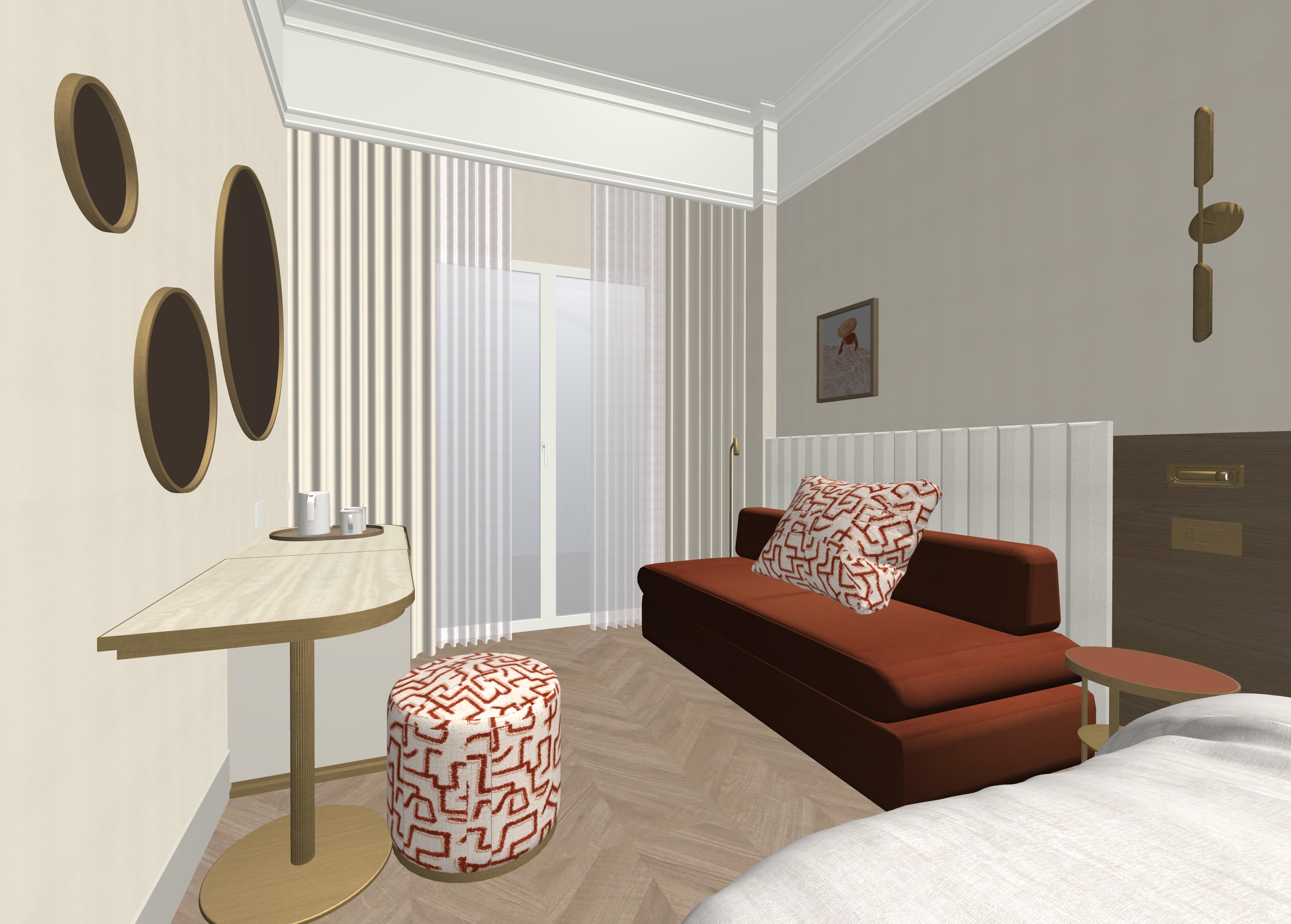 camera di hotel la testata del divano letto ha una retroilluminazione a led solo sulla parte alta gli specchi tondi sulla sinistra hanno una retroilluminazione la veletta della tenda ha una strip led incassata che illumina la tenda l applique a destra accesa la carta da parati ha un leggero effetto tessuto chiaro la testata del divano letto in ecopelle bianca fai entrare della luce naturale dalla finestra