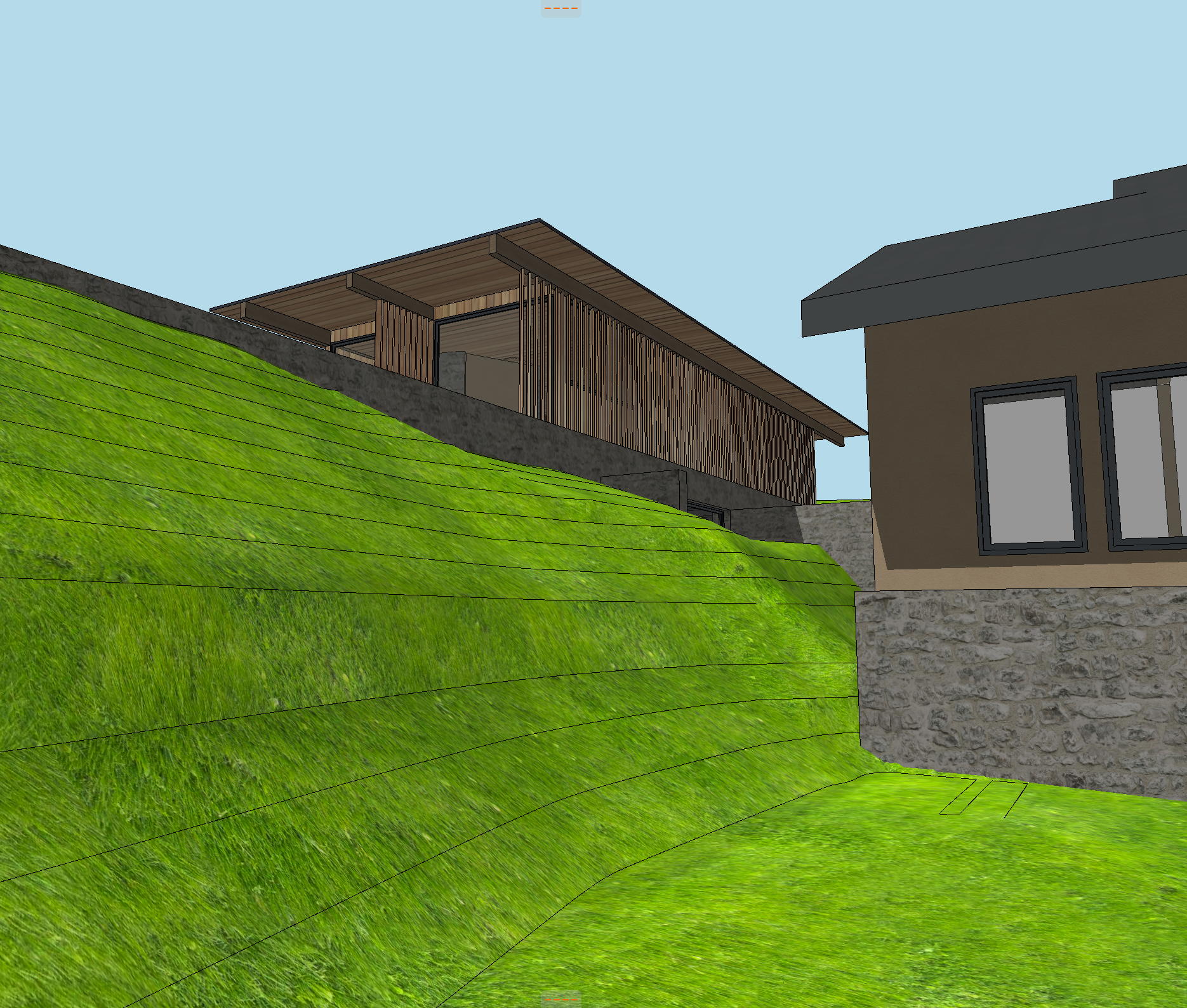 landscape hillside with sagebrush and tall wild grasses brown drystack stone walls corten standing seam metal roof