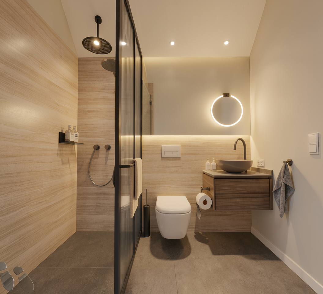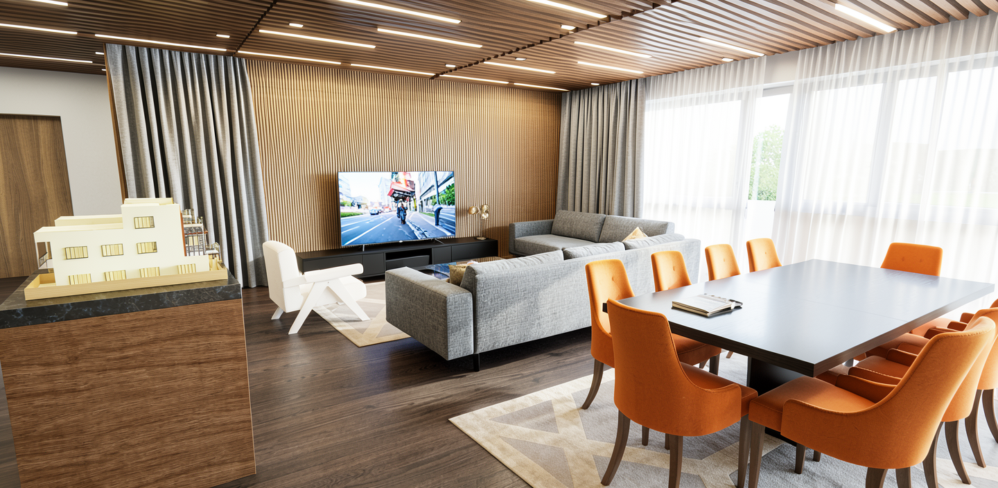 futuristic immersive exhibition space dark ambient environment dramatic cinematic lighting large open industrial hall with black ceiling strong directional spotlights with visible light beams soft atmospheric haze glowing yellow brand panels emitting light sleek modern presentation stage minimal premium design glossy but subdued floor reflections modular exhibit kiosks with integrated screens business attendees in small groups interacting naturally slight motion blur on walking people volumetric lighting high end experiential design ultra realistic octane render unreal engine style cinematic composition depth and contrast premium brand experience