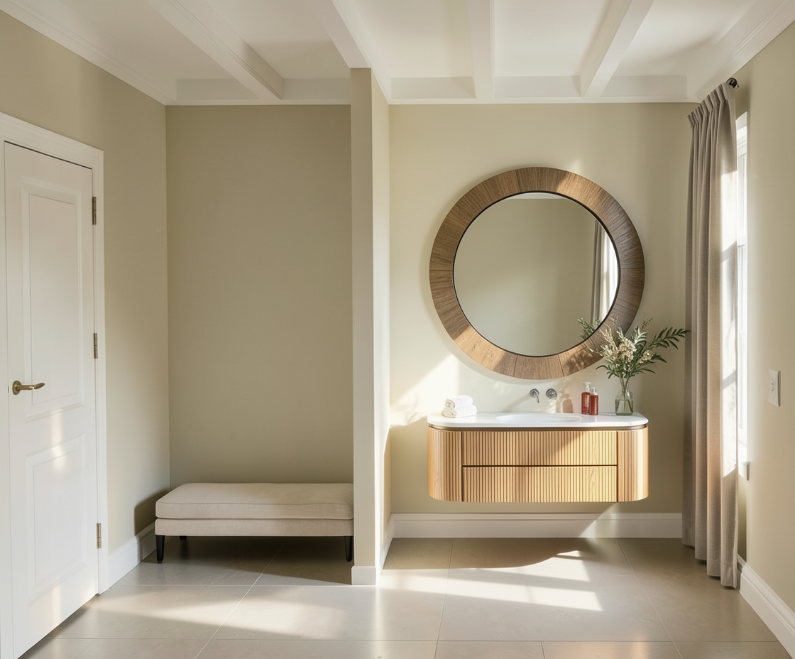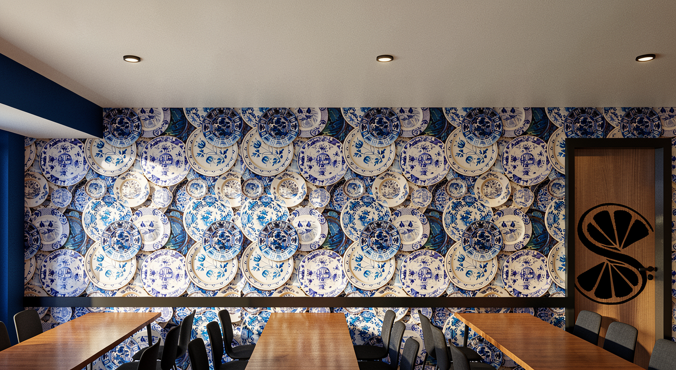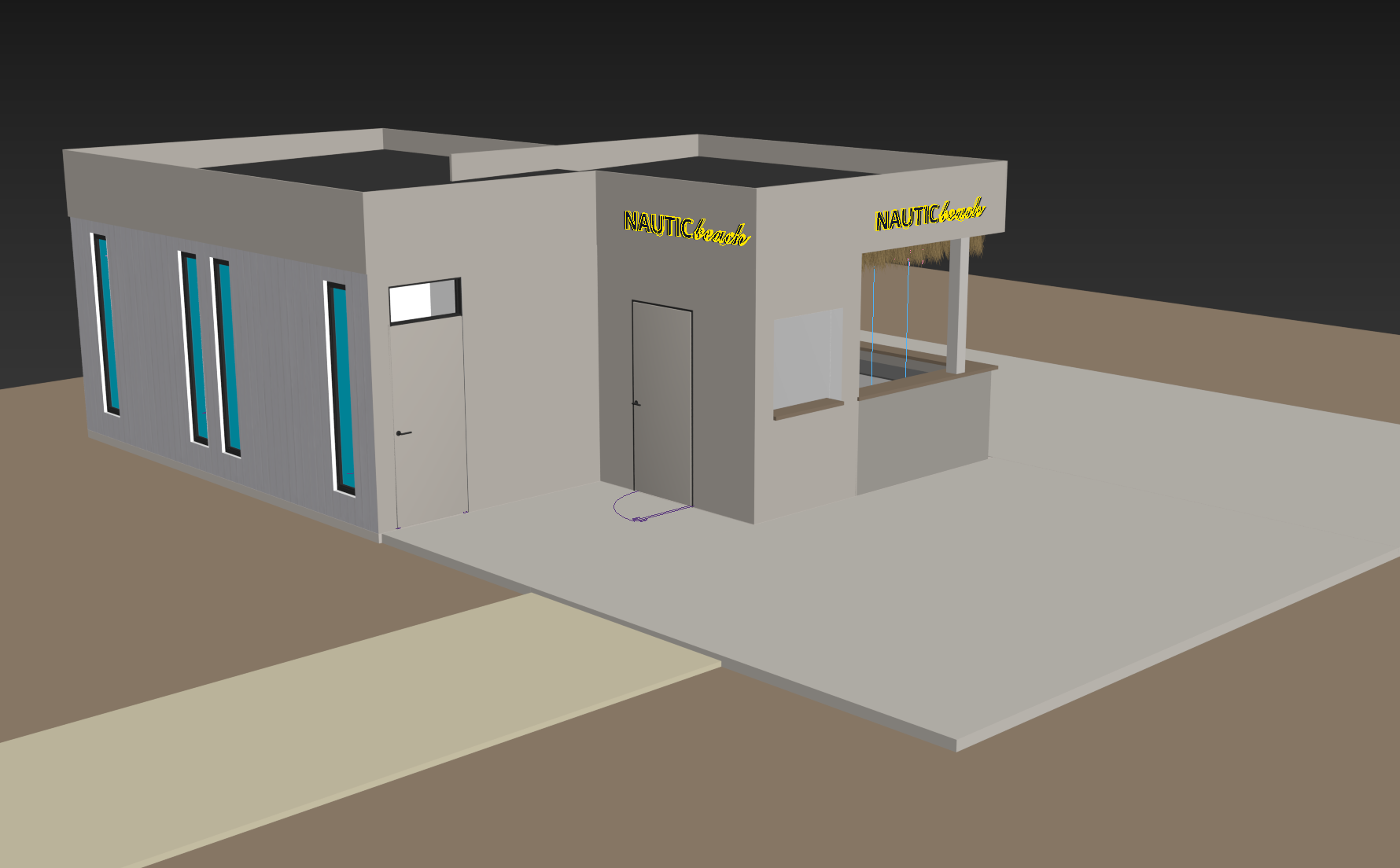 render this beach bar with a beautiful wall finish of textured microcement in light beige and vertical wood paneling add people add realism add sand and palm trees in concrete planters the floor is a wooden deck painted in light beige add lighting add a beach background with lounge chairs and umbrellas the logo is navy blue with a warm backlight