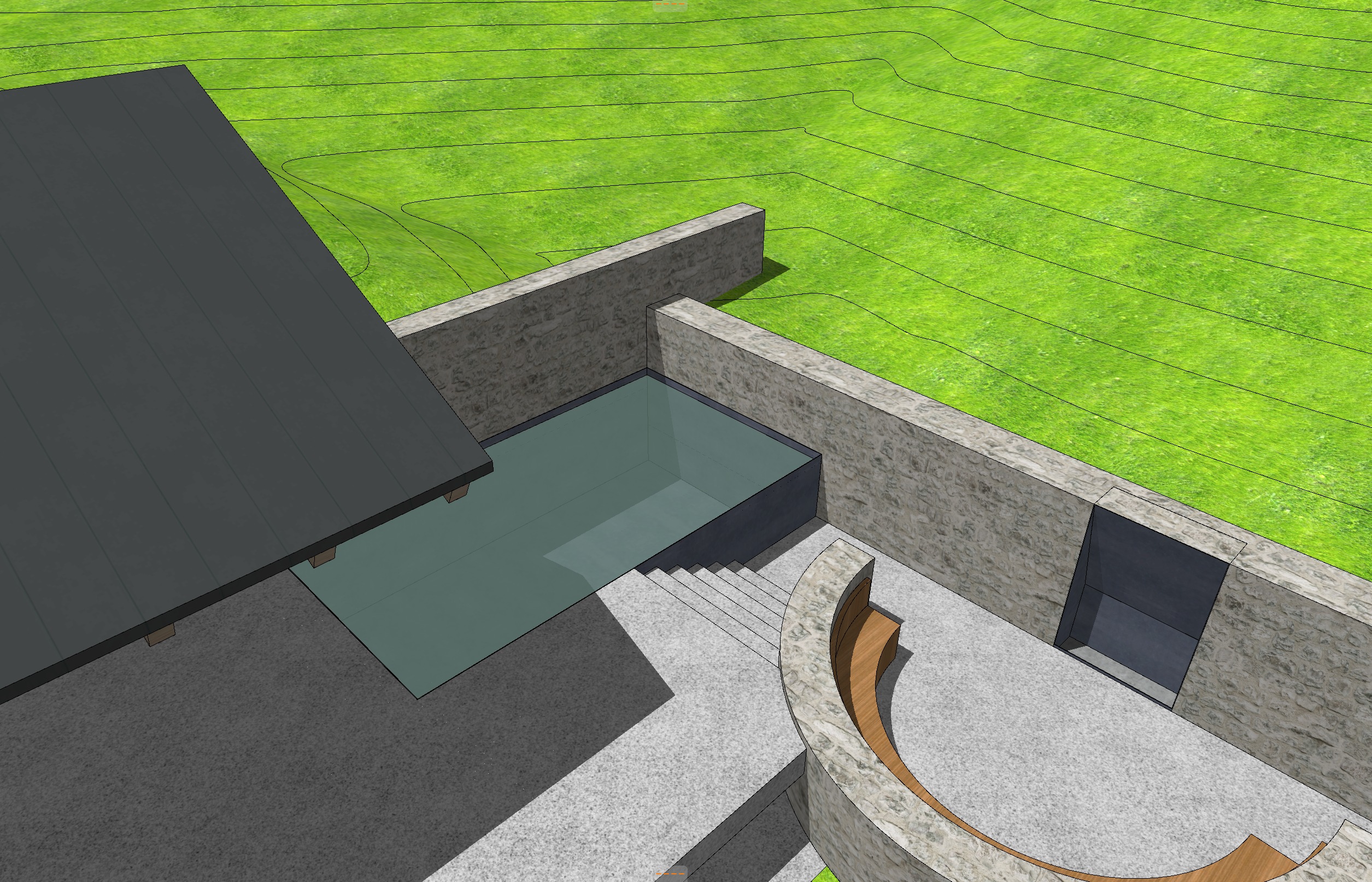 evening light grasses brown drystack stone walls fire in fireplce people in pool people sitting in the curved bench bench material to be outdoor furniture cushions