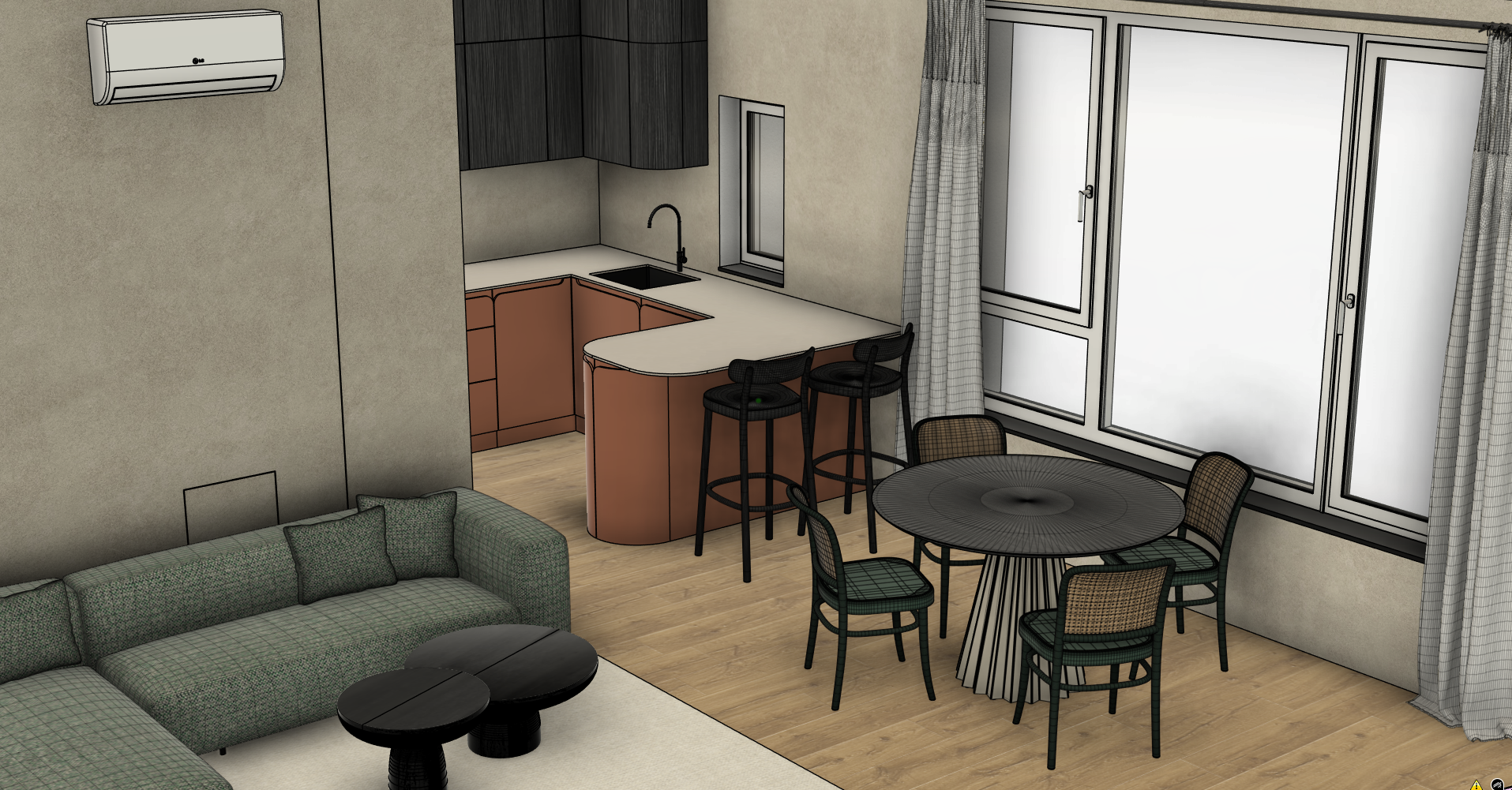 use the provided image as a strict reference for camera angle composition proportions furniture placement and architecture maintain the exact geometry and layout of the scene transform the reference into a high end photorealistic interior visualization with refined materials and natural lighting ensure that all visible 3d objects have smooth geometry remove or smooth any visible mesh structure or polygon edges so that furniture cabinetry and architectural elements appear clean continuous and professionally modeled with no faceted surfaces or low poly artifacts soft sunlight enters through the large window on the right side creating gentle shadows and a calm atmosphere living area a medium dark green fabric sofa with rich woven textile texture is placed along the wall the green color should be slightly cool toned and elegant below the sofa is a light grey rug with a soft but visible fiber structure the two coffee tables in front of the sofa are made from light warm toned concrete matte surface with subtle natural imperfections kitchen cabinetry is terracotta colored with precise integrated milled finger pull handles following the reference geometry upper kitchen cabinets are black stained wood with subtle wood grain the upper cabinet corner near the window is rounded creating a soft curved transition at the end of the cabinet the countertop is light grey stone with a refined matte finish install warm led strip lighting under the upper kitchen cabinets creating soft functional illumination of the countertop the wall on the right side near the window is finished with warm toned concrete microcement plaster this surface continues seamlessly into the kitchen corner and also forms the backsplash area beneath the upper kitchen cabinets creating one continuous material surface the kitchen peninsula is rounded on the side where the passage occurs the base of the peninsula forms a precise semicircle creating a soft curved circulation path the countertop extends beyond this curved base forming a slight overhang that creates comfortable leg space for seating at the peninsula there are bar stools made from black stained wood elegant and minimal matching the darker wood elements used elsewhere in the interior on the upper part of this wall there is a wall mounted air conditioning unit behind the sofa there is also a small flush service door outline finished in the same microcement surface dining area near the window a round dining table made from black stained wood stands near the window the table has a beige sculptural base with a soft matte finish around the table are dark green dining chairs in a slightly cooler green tone elegant and modern with dark frames seat upholstery in textured fabric and backrests made from woven natural rattan cane window and curtains large window and balcony door allow soft natural daylight to fill the interior the window frame color is bright white clean and crisp light textured curtains hang on both sides of the window ceiling and lighting the ceiling is finished with smooth white plaster flooring the floor is brown natural oak wood matte finish with subtle grain style ultra photorealistic architectural visualization natural materials soft daylight warm balanced tones high material realism subtle imperfections elegant modern apartment interior architectural photography style