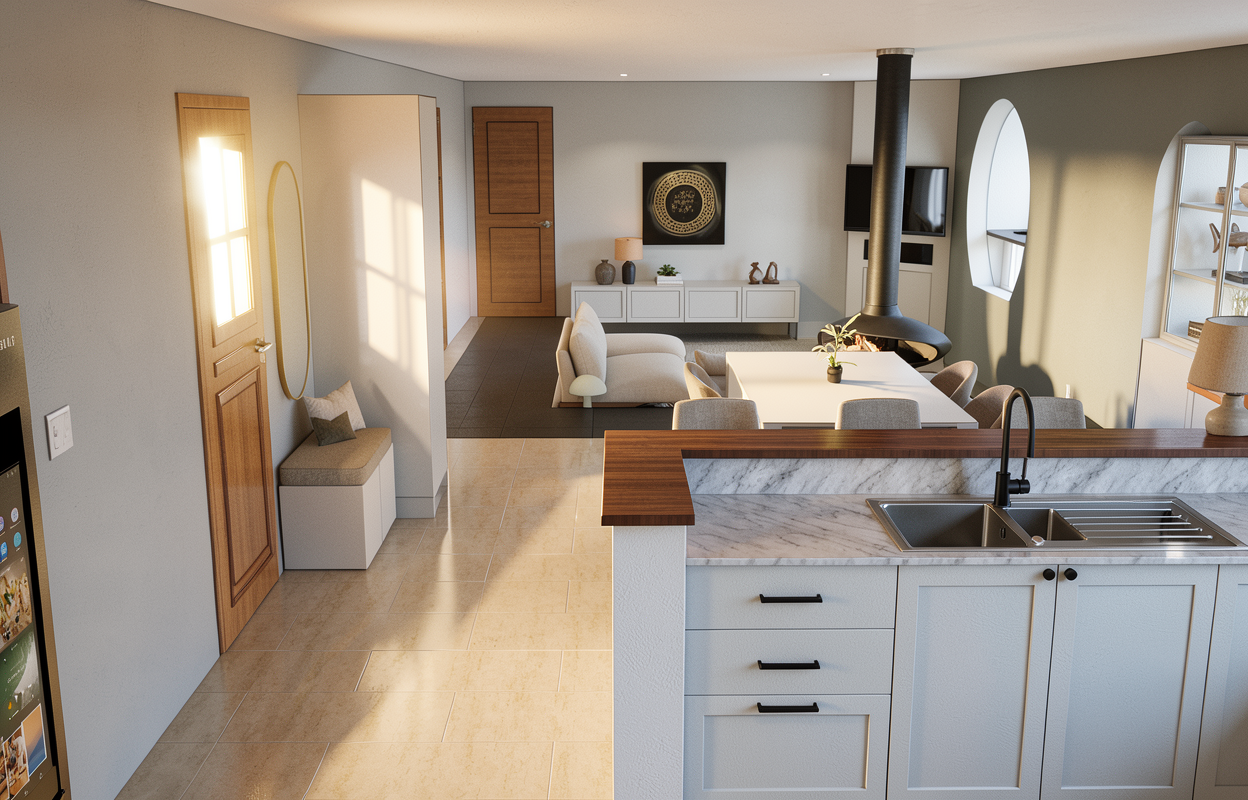 apply to the original image without altering composition geometry proportions structural grid mullions or facade depth competition level architectural rendering with high realism refined lighting and precise material definition maintain the calm rhythmic vertical articulation above the canopy as previously defined restrained analytically spaced vertical elements embedded within the facade system not applied as a secondary layer the entire facade above the canopy including the parapet attica must be finished uniformly in ral 9006 aluminum silver with a powder coated metallic finish satin or semi matte appearance non glossy subtle light reflection typical for coated aluminum surfaces the roof build up above the parapet should be slightly lighter than the facade maintaining a restrained tonal contrast within a light metallic grey spectrum all window elements and the facade areas directly below the windows must share the same slightly dark subtly reflective glazing appearance with consistent material behavior expanded metal elements must feature clearly visible coarse porosity large diamond shaped apertures medium to large mesh scale industrial character clearly legible from distance no fine mesh no micro perforation no dense lattice finished in the same ral 9006 satin metallic tone as the rest of the facade the canopy and the wall beneath the canopy must be executed in slightly dark grey exposed concrete appearance homogeneous concrete surface subtle texture architectural fair faced concrete quality no change in building massing surface articulation limited strictly to the facade above the canopy