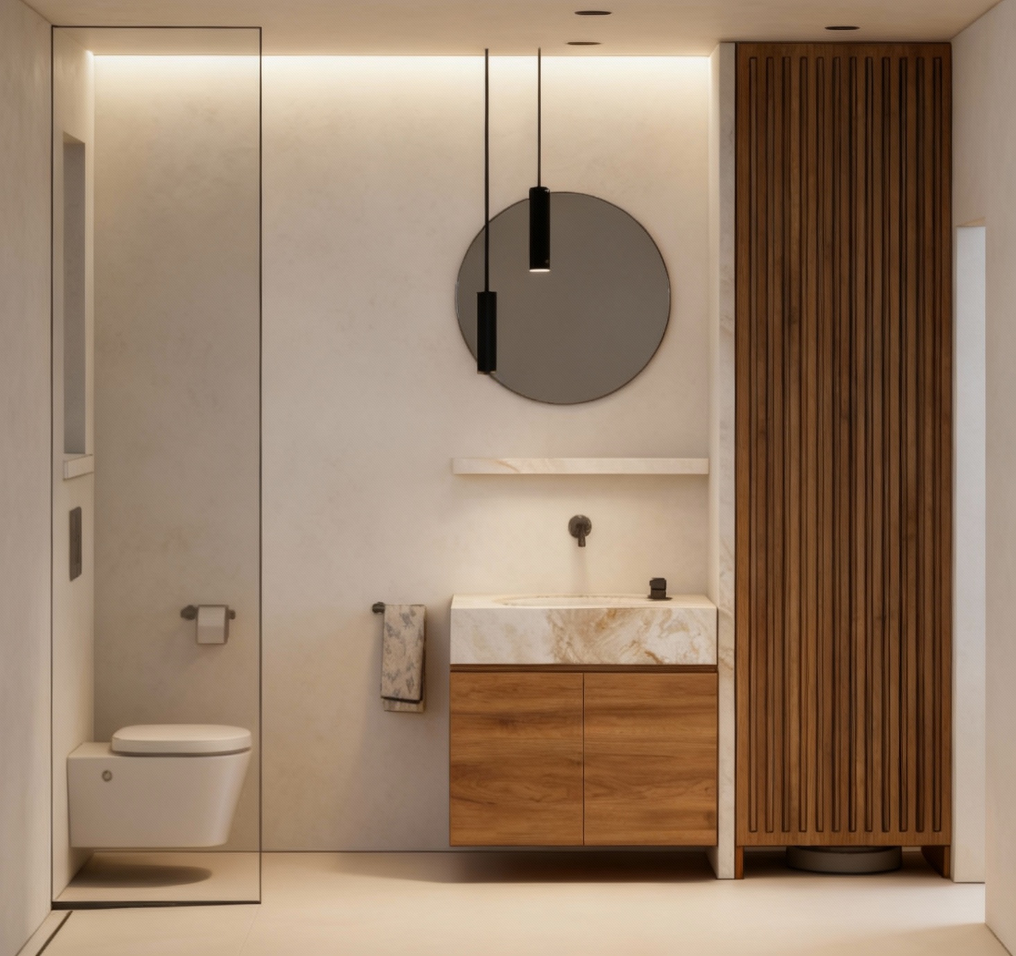 hyper realistic image minimalistic bathroom walls and floor from light white beige microcement washbasin from marble cabinet from natural oak veneer circular mirror black mat pendant lamps natural light through the window on the right