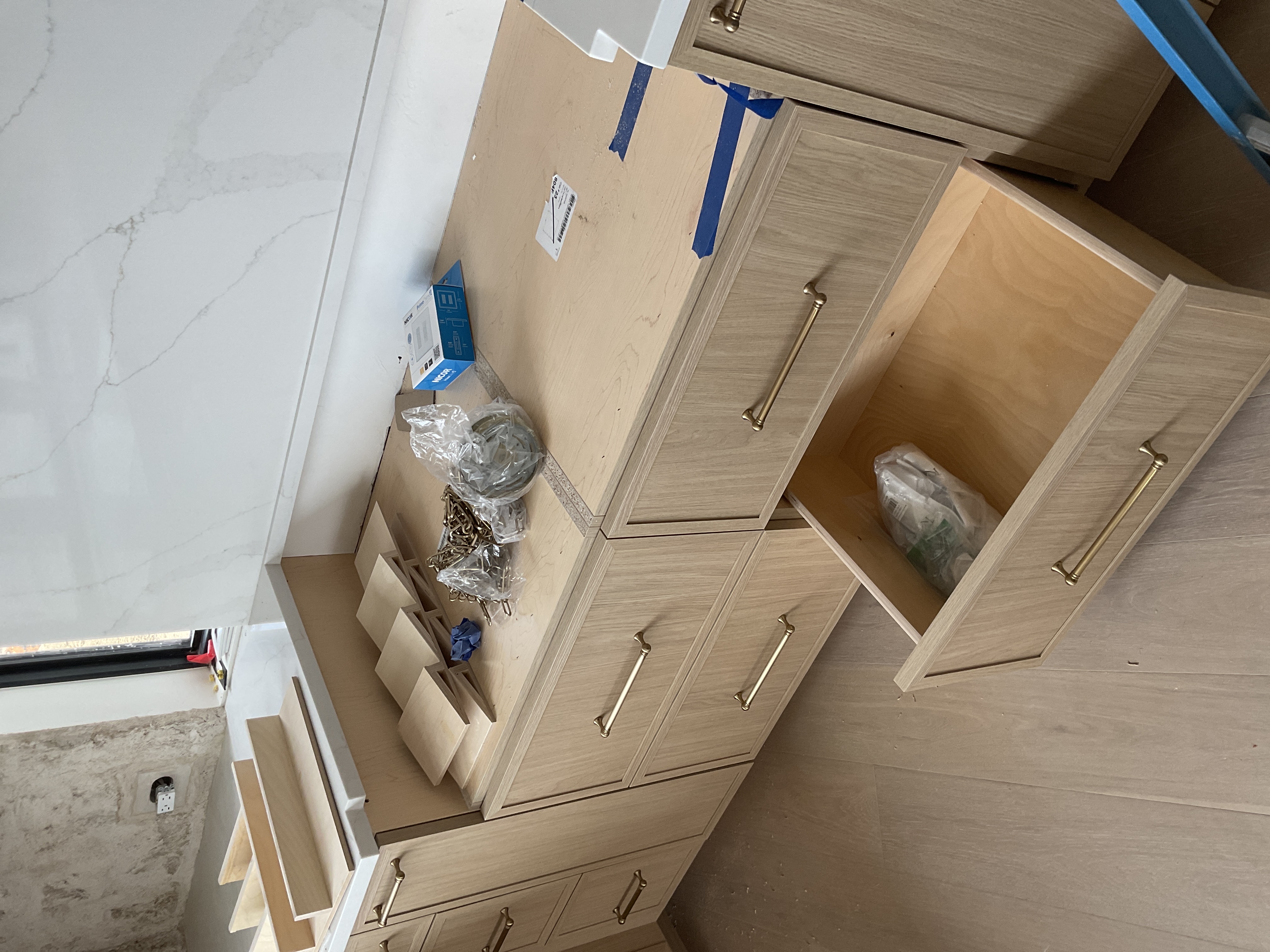 do not change the cabinets in any way preserve the exact cabinet colors materials finishes dimensions door and drawer styles hardware spacing alignment and all geometry exactly as shown do not alter the countertop shape backsplash appliances flooring lighting fixtures or wall structure only remove the construction materials clutter and mess from the scene clean the room and make it look finished and staged add a few simple tasteful home accessories appropriate for the style of the space such as a small plant soap dispenser or hand towel but do not add or remove any furniture windows or architectural elements maintain the original lighting direction and realism enhance clarity and polish the photo while keeping the cabinetry and room design completely unchanged add a rangetop on the drawers that has controls on the front to fit the entire opening stage the drawer with pots do not change anything with the cabinet layout or color