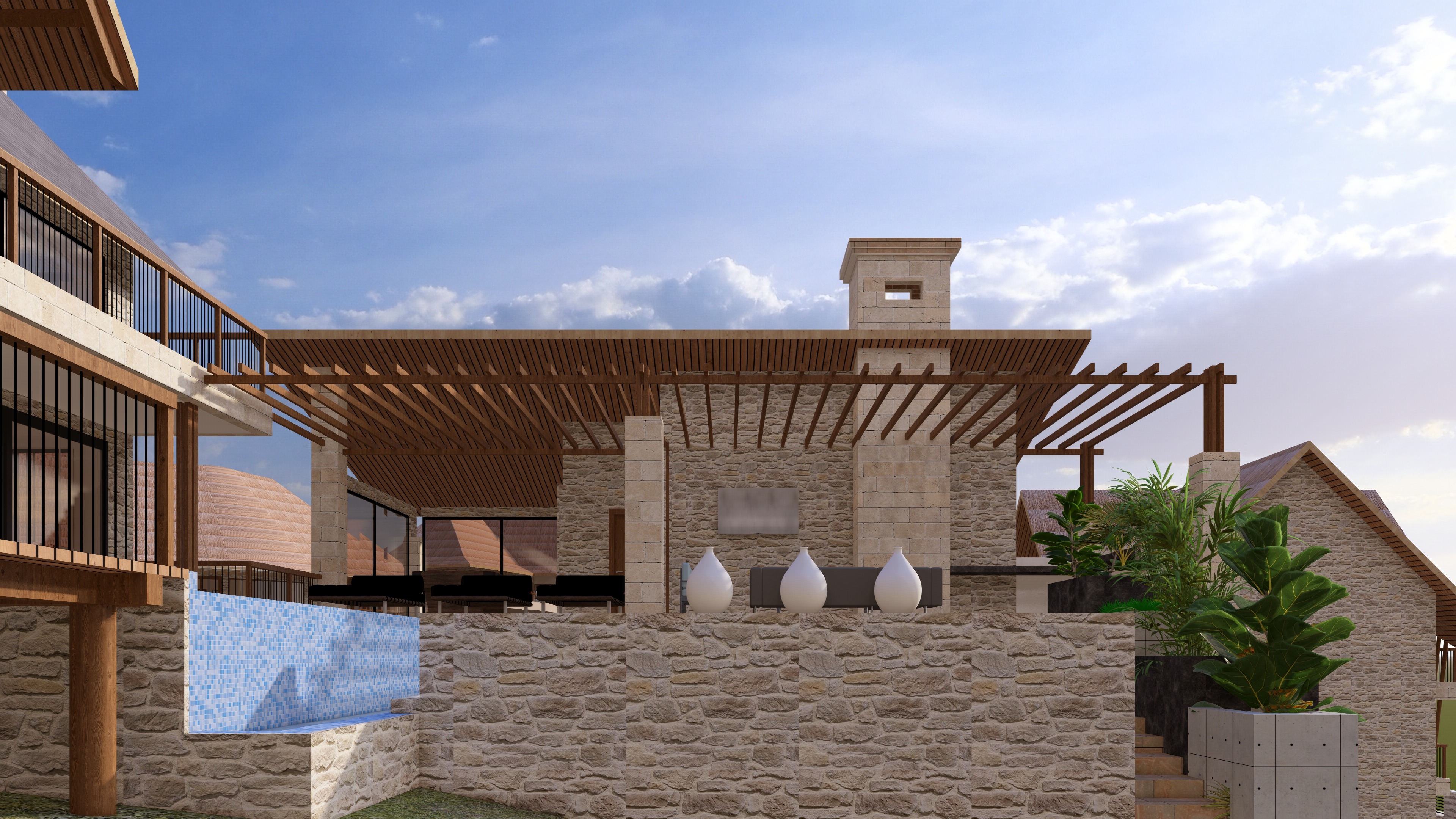 this is a model of a resort add few trees in background and far background add some little neat vegetation for context add dim warm interior lighting make it look lived in the rectangular thing centrally placed on the wall infront is a tv make it wider and live
