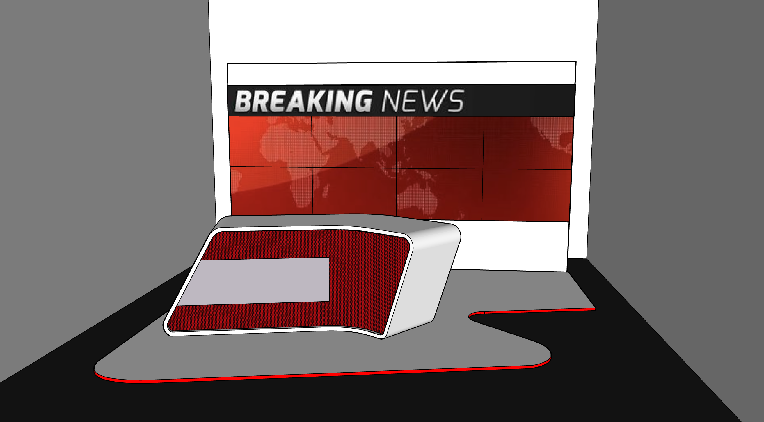renderiza esta imagen es un plato de televisi n agrega en el techo como focos de plato negros y quiero que a adas en la trasera un panel de pantallas la superficie blanca del suelo es una placa de pvc blanca por lo que tiene que tener brillo la idea es que la zona roja que se ve debajo es un led perimetral rojo la mesa del centro es una estructura igual de pvc blanca y el frontal es una rejilla roja perforada quiero que haya como una luz led que lo retroilumine en rojo y en la parte central que queda en gris el rect ngulo es una chapa de inoxidable