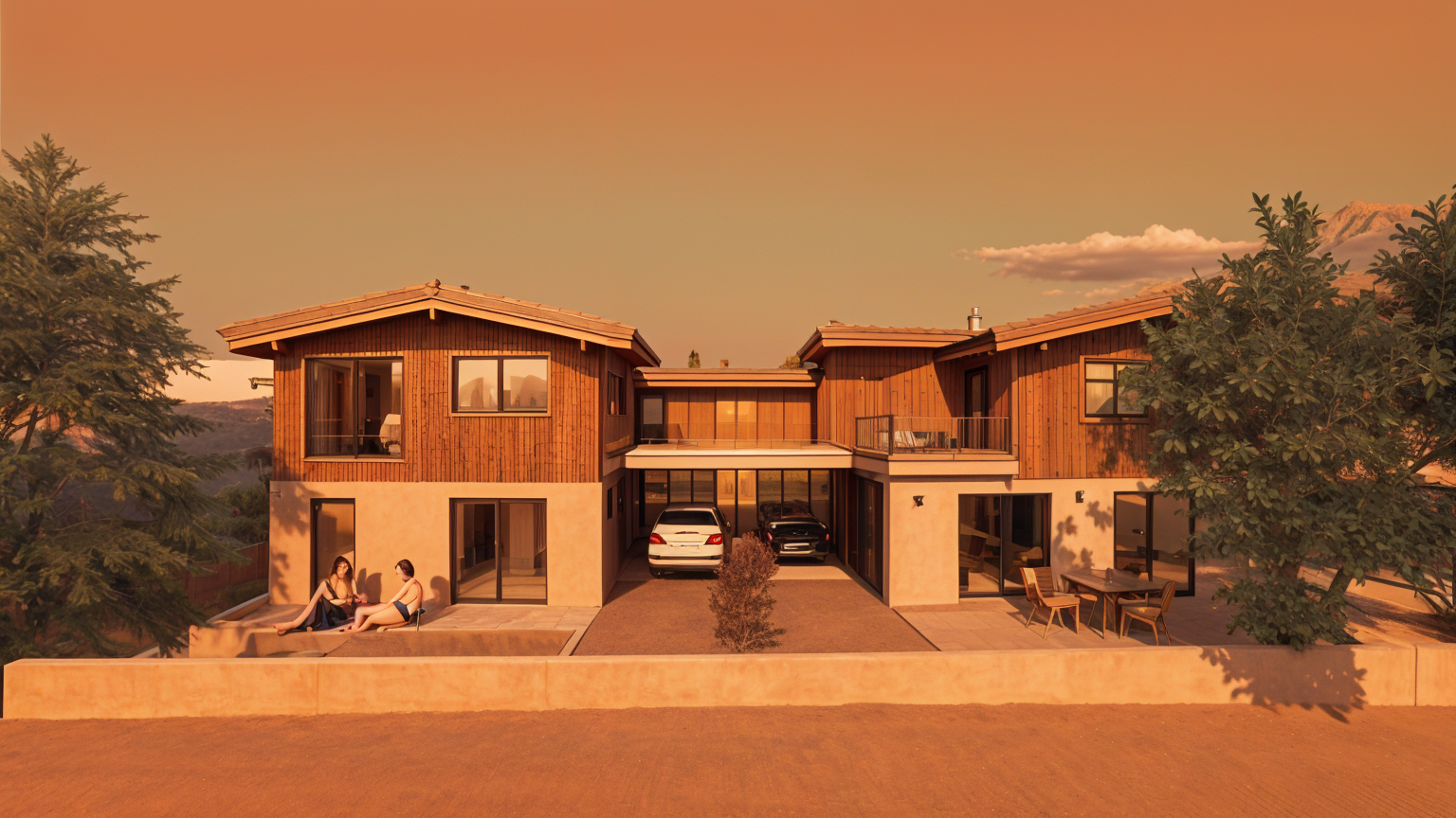 exterior shot render a modern dual story house with a sleek contemporary design featuring wooden paneling in light tan and white walls the roof is dark gray contrasting with the house s bright exterior include large black framed windows for an elegant touch surround the setting with lush vibrant green trees and a well maintained lawn the sky is a clear rich blue evoking a serene atmosphere in front of the house two cars are parked in a gravel driveway adding a luxurious feel capture an inviting ambiance with people lounging near the house enjoying a peaceful day