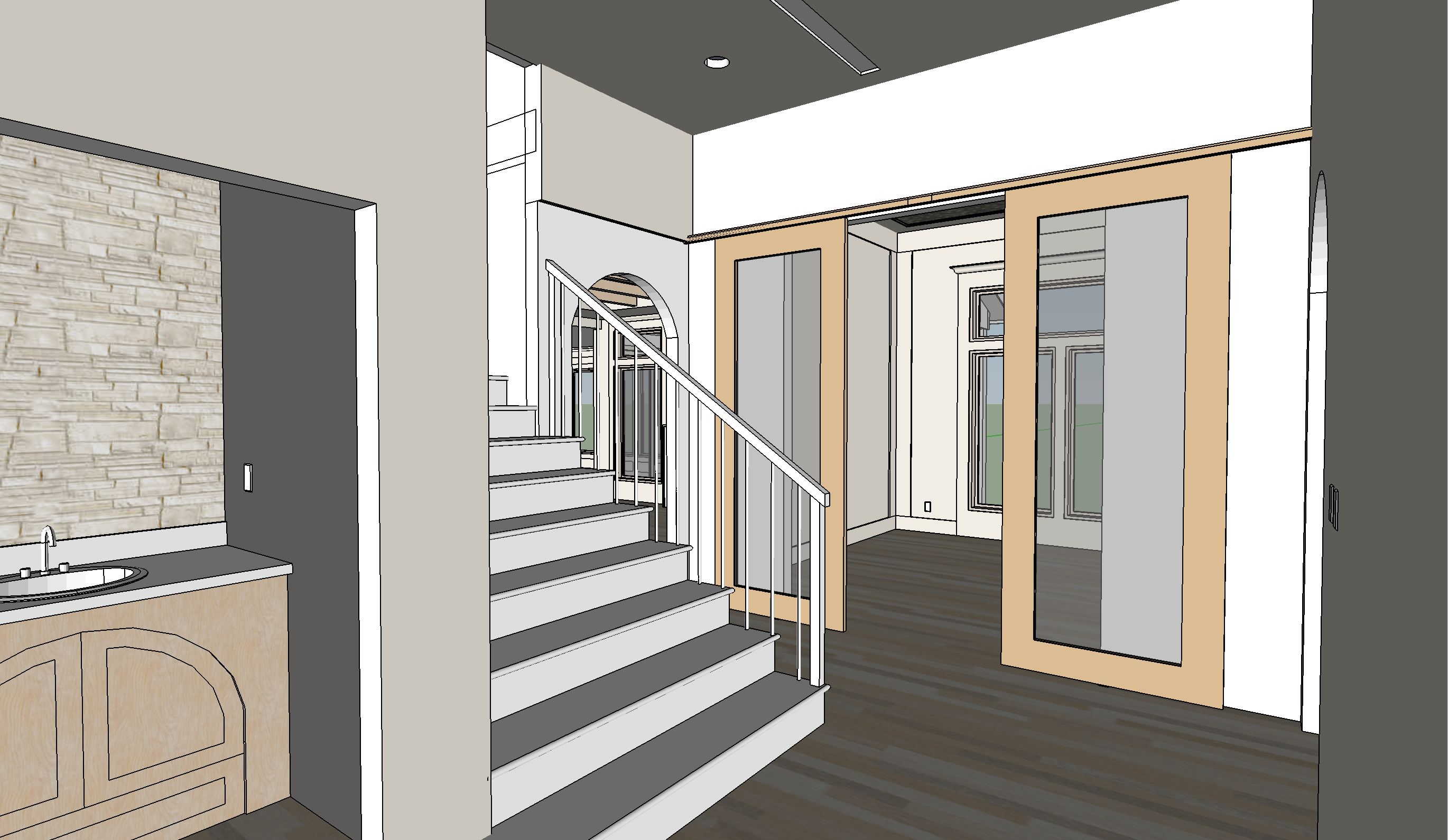 render this to look photorealistic with a warm cream wall and a textured carpet on the stairs iron spindles with stain railing the floors to match the tone of the base image as a light white oak the ceiing color should match the walls