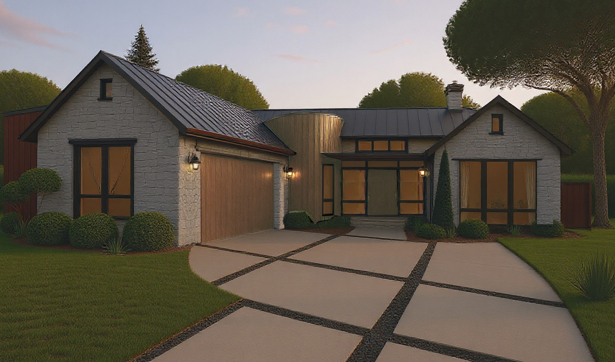 modern farmhouse blended grey saw cut stone natural wood tones on entry door garage door and round tower