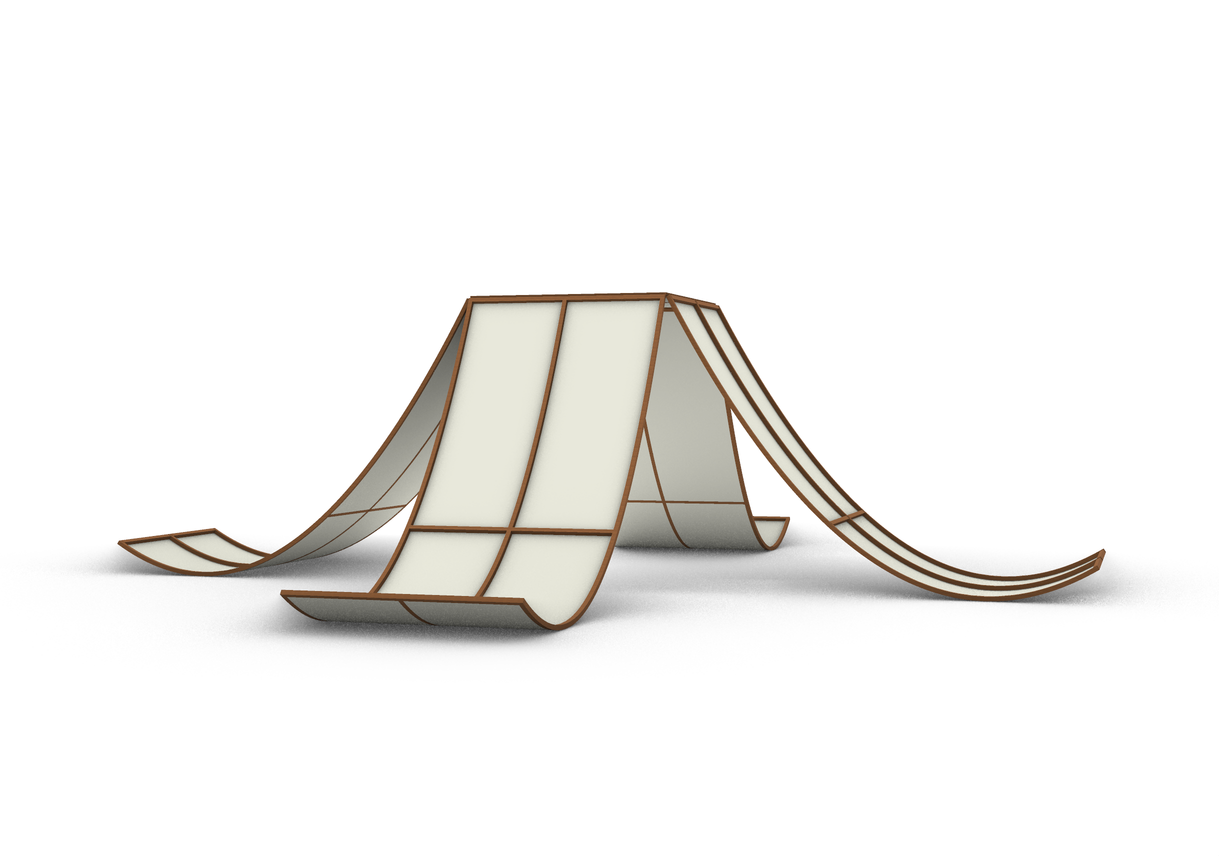 realistic view of a timber and linen fabric pavilion in a ytranquil and minimalist park add people standing underneath enjoying the pavilion raise the pavilion to make it look like it s floating from the ground