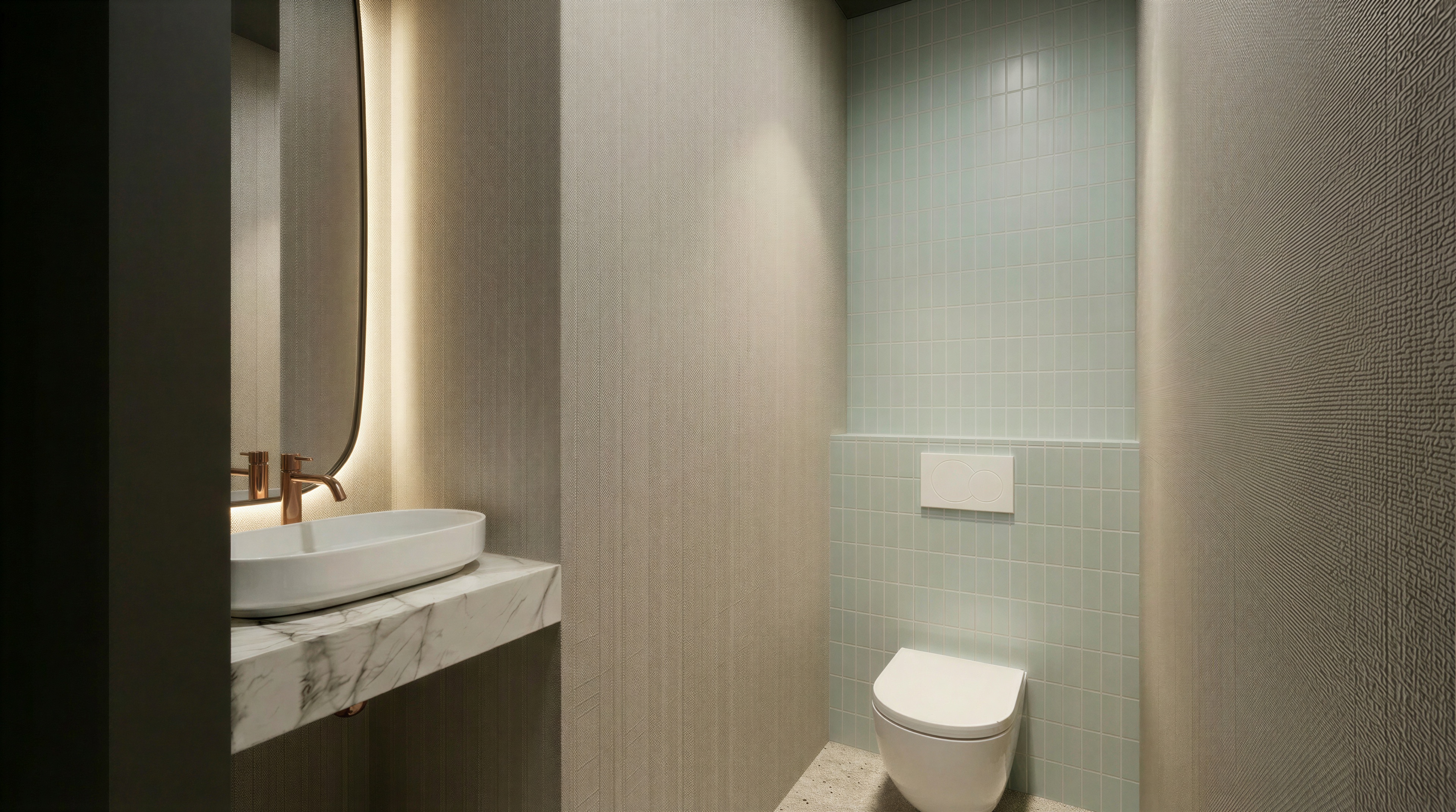 put 2 long vases with eucalyptus on the right side of the toilet cistern don t change any else