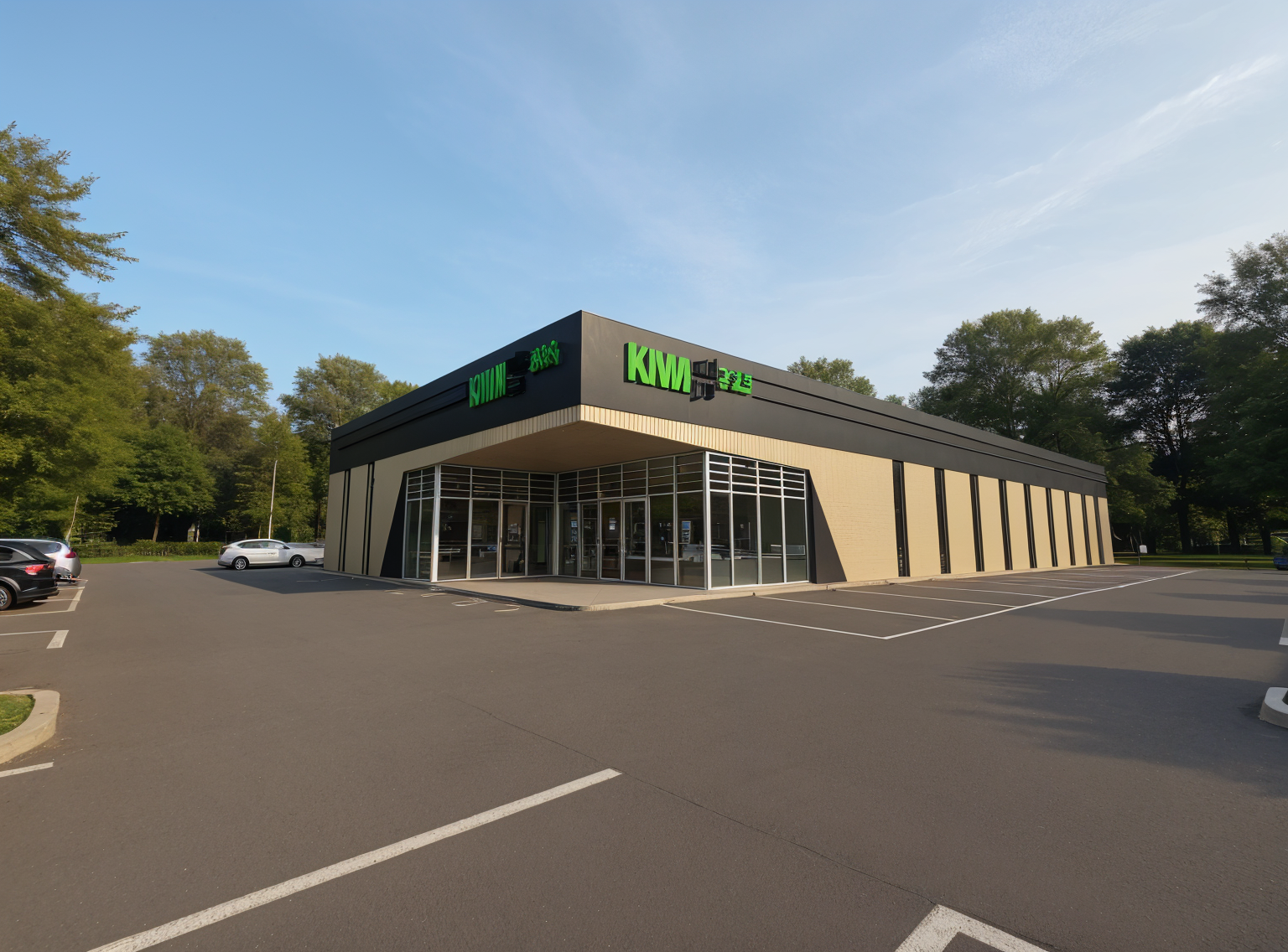 parking lot in front of the store add a few cars sunny weather blue sky slightly overcast small trees in the background in some distancnce