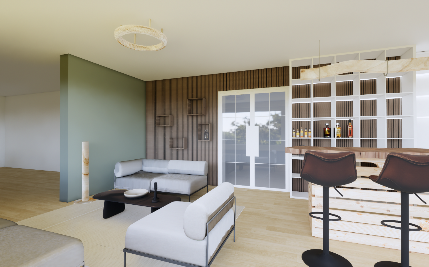 render a modern living room interior with a serene atmosphere use soft olive green for the accent wall paired with natural wood planks on the other wall design the bookcase with a clean white frame and natural wood backing incorporate a comfortable light grey sectional sofa and add a chic low black coffee table position dark brown leather bar stools in front of a light wood bar illuminate the space with a subtle creamy white ceiling light feature a soft beige floor and ambient natural lighting for an inviting and warm feel