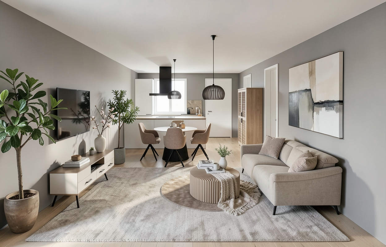 6pm evening a modern two story house with a sleek design and hip roofs light earthtone stone surrounds the entry and base the roof is a dark charcoal color adding contrast large windows dominate the facade reflecting the clear blue sky the front door is very dark stained wood surrounding the house a lush green lawn with colorful flower beds in shades of pink lavender and yellow lansdcape stones dot the yard framing plantings the atmosphere is serene and welcoming with evening sunlight casting gentle shadows do not modify the massing as shown