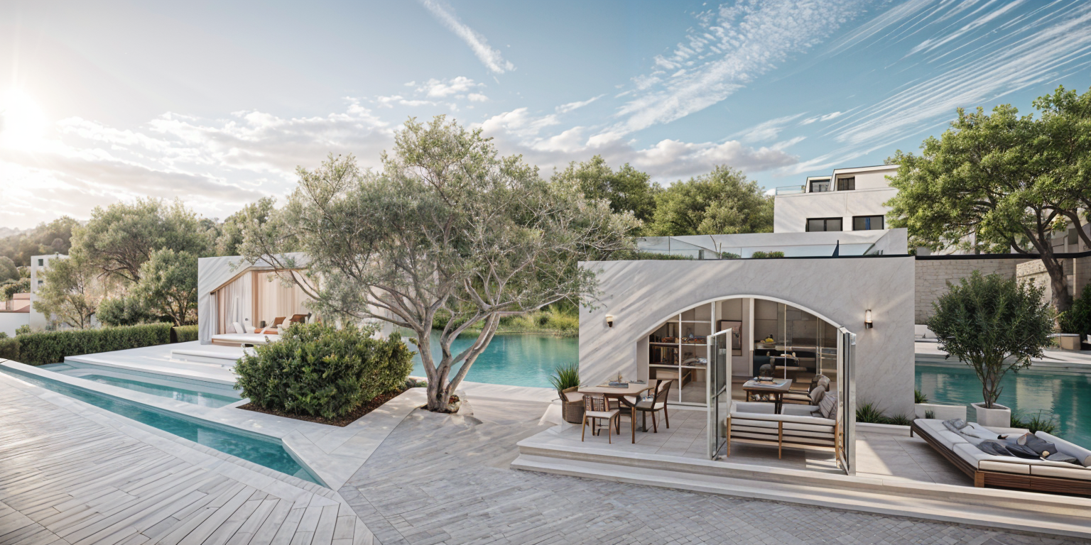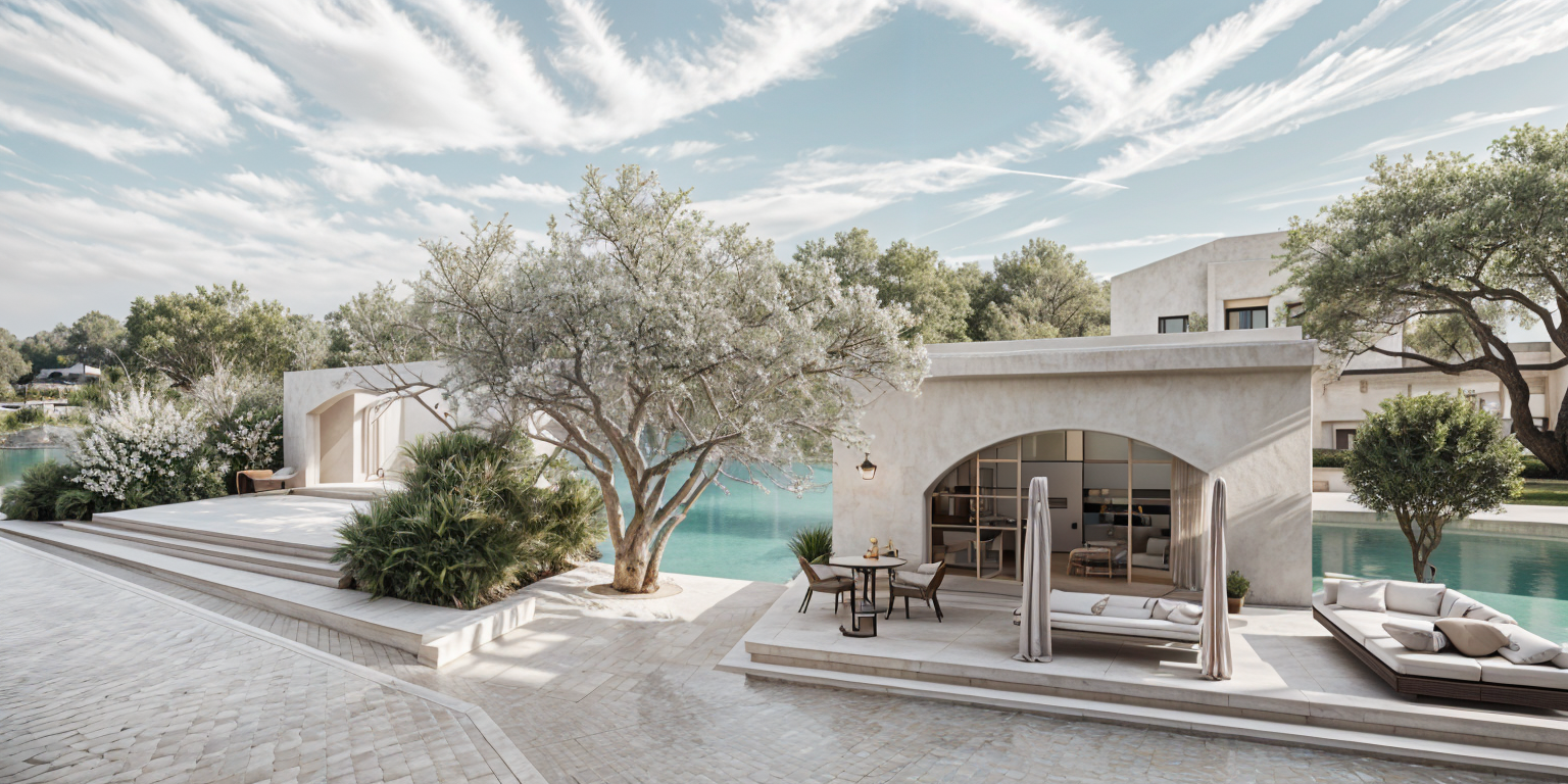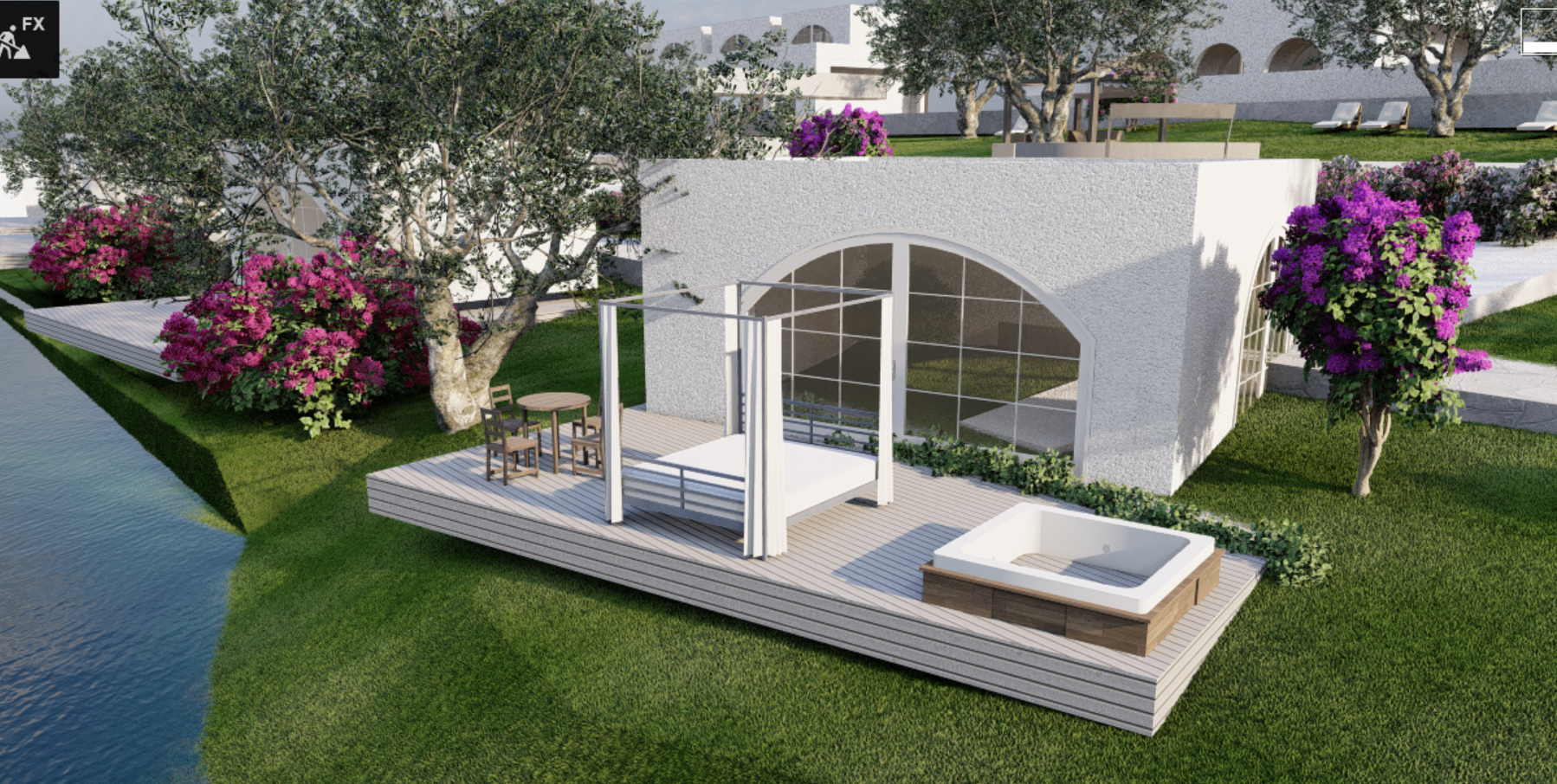 exterior shot resort by the lake mentain exact geometry jakuzzi bed outside table with sampain glass