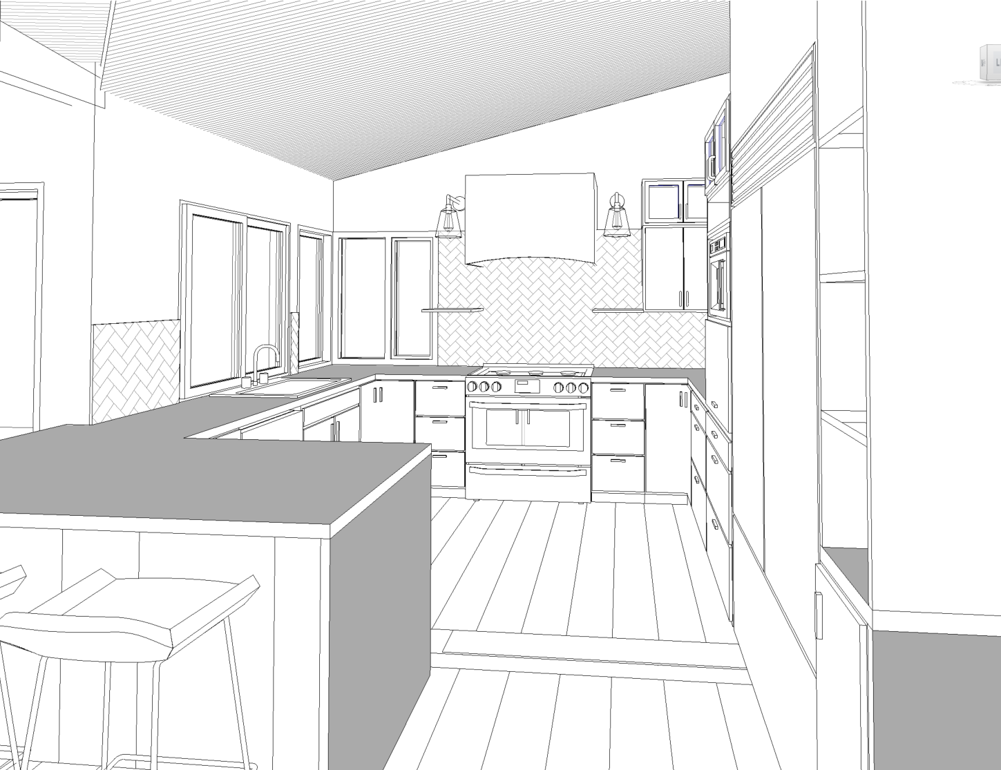 interior shot interior design sketch of modern cottage kitchen with light sage green shaker cabinets beige countertop and backsplash and wooden farmhouse counter stools