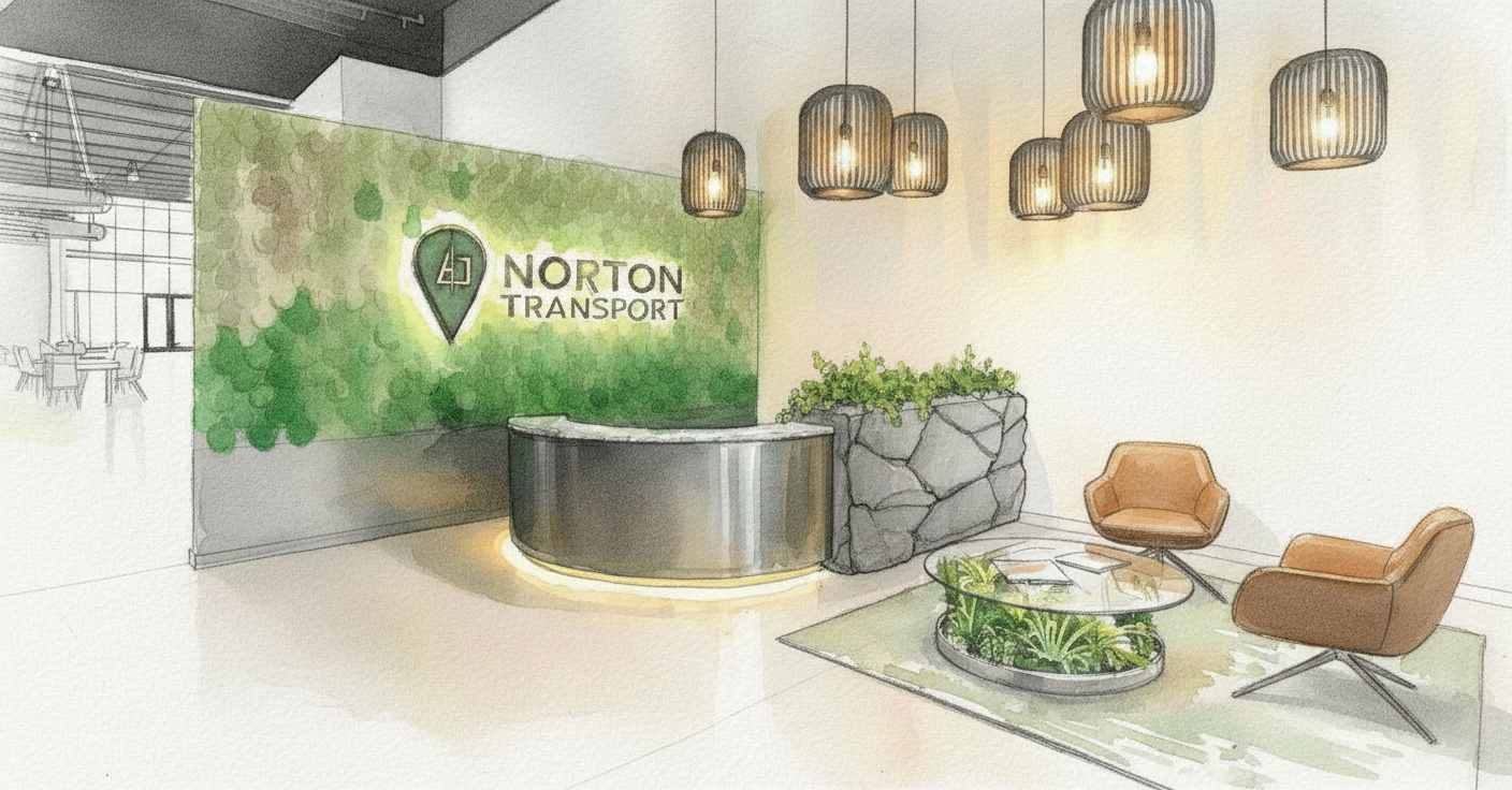make the logo on the back feature wall resemble the reference image keep the image the same size and keep everything else the same keep the norton transport
