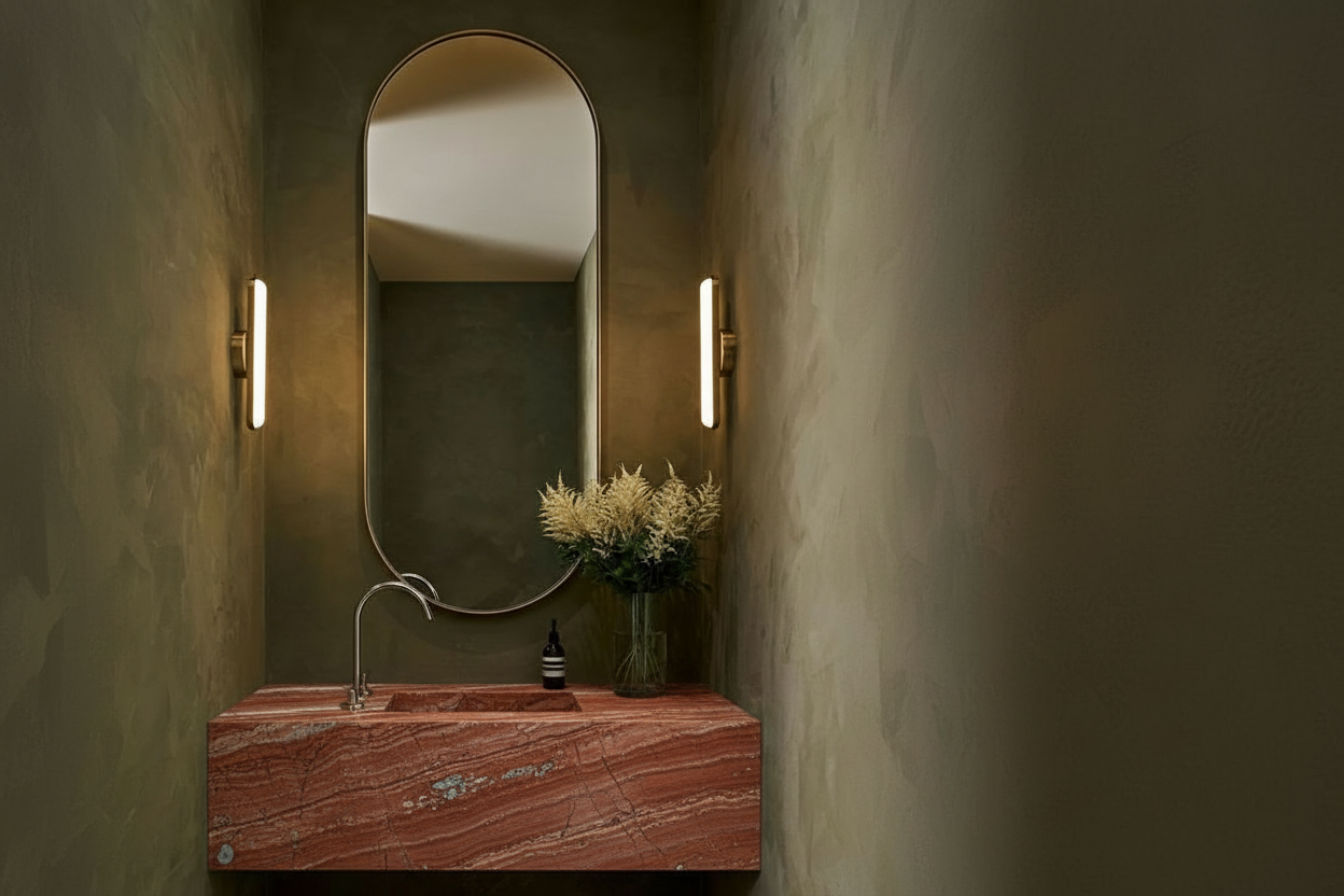 preserve the exact layout camera angle and placement of all elements do not move or redesign anything add a horizontal niche on the west wall of the shower