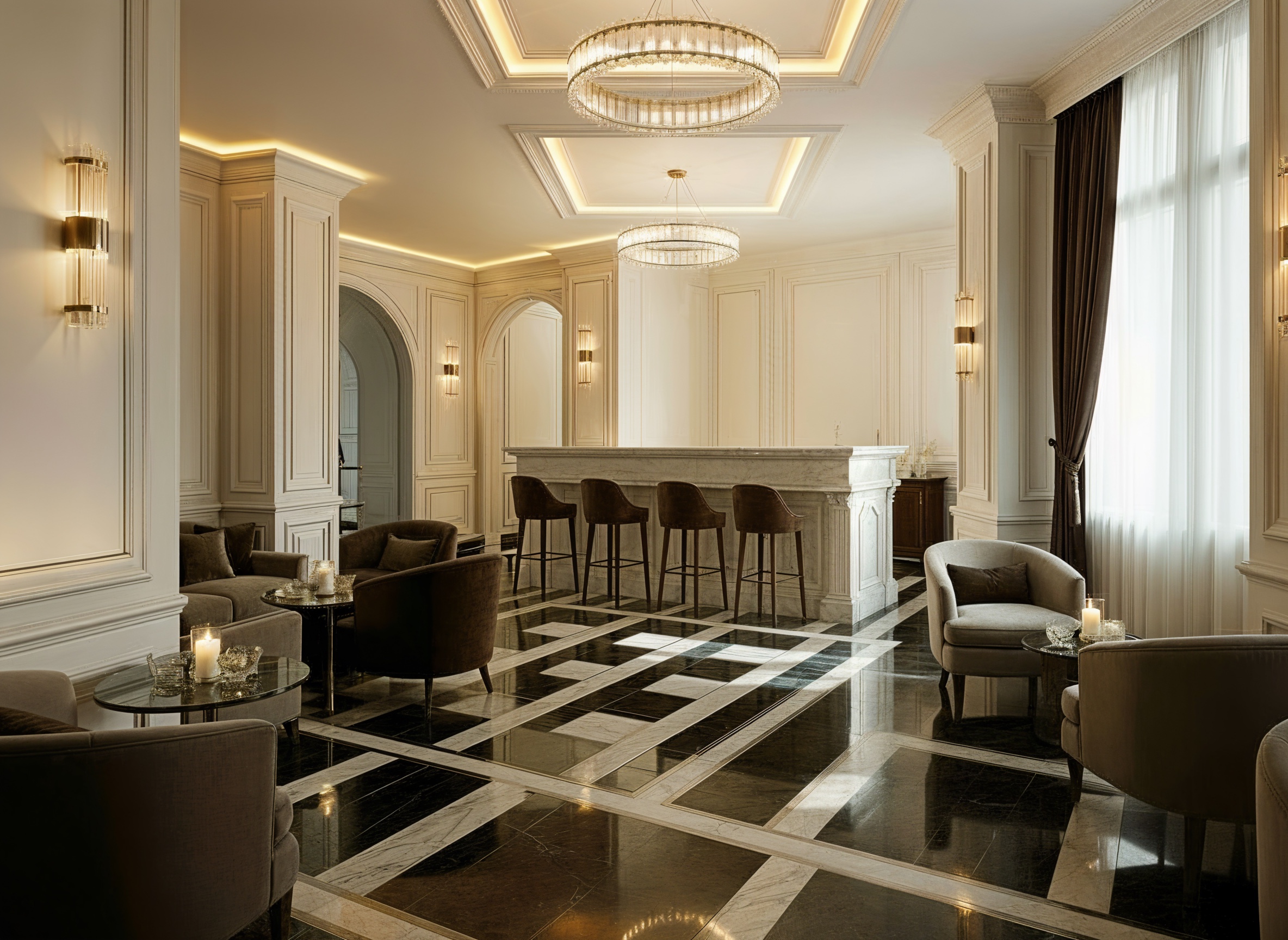 enhance the existing hotel bar scene with ultra photorealistic detail sharpening textures materials and atmospheric depth while preserving the entire room layout stone bar placement wall geometry windows and architectural scale exactly as they are do not alter spatial proportions openings or structural relationships moldings and trimmings refine all wall paneling cornices and decorative trims to be strictly geometric linear and symmetrical with clean angles and precise intersections remove any floral organic or rounded motifs reinforcing a restrained modernized neoclassical aesthetic preserve original proportions alignment and hierarchy emphasize a warm ivory and cream palette with rich gold and brass accents subtly deepened in tone to enhance intimacy and richness bar refinement enhance the stone bar to emphasize its classical fa ade character with subtle plaster like texture no veining crisp rectangular geometry and refined detailing maintain its exact size position and proportions add deeper warm highlights and soft reflective shadows on the stone and brass detailing to heighten sensuality and tactile luxury atmospheric enhancements deepen shadows throughout the room to create a darker more intimate cinematic lounge atmosphere emphasize warm ambient glow and soft rich reflections on walls floors and bar surfaces materials should feel tactile inviting and opulent with subtle contrasts that heighten drama without losing clarity staging additions add restrained high end lounge details such as refined bar accessories or decanters keeping all additions minimal and cohesive without altering the bar or architectural layout ensure all enhancements remain fully coherent with the room s grand formal composition strengthening warmth intimacy sensuality and depth without changing any original geometry layout or structural features