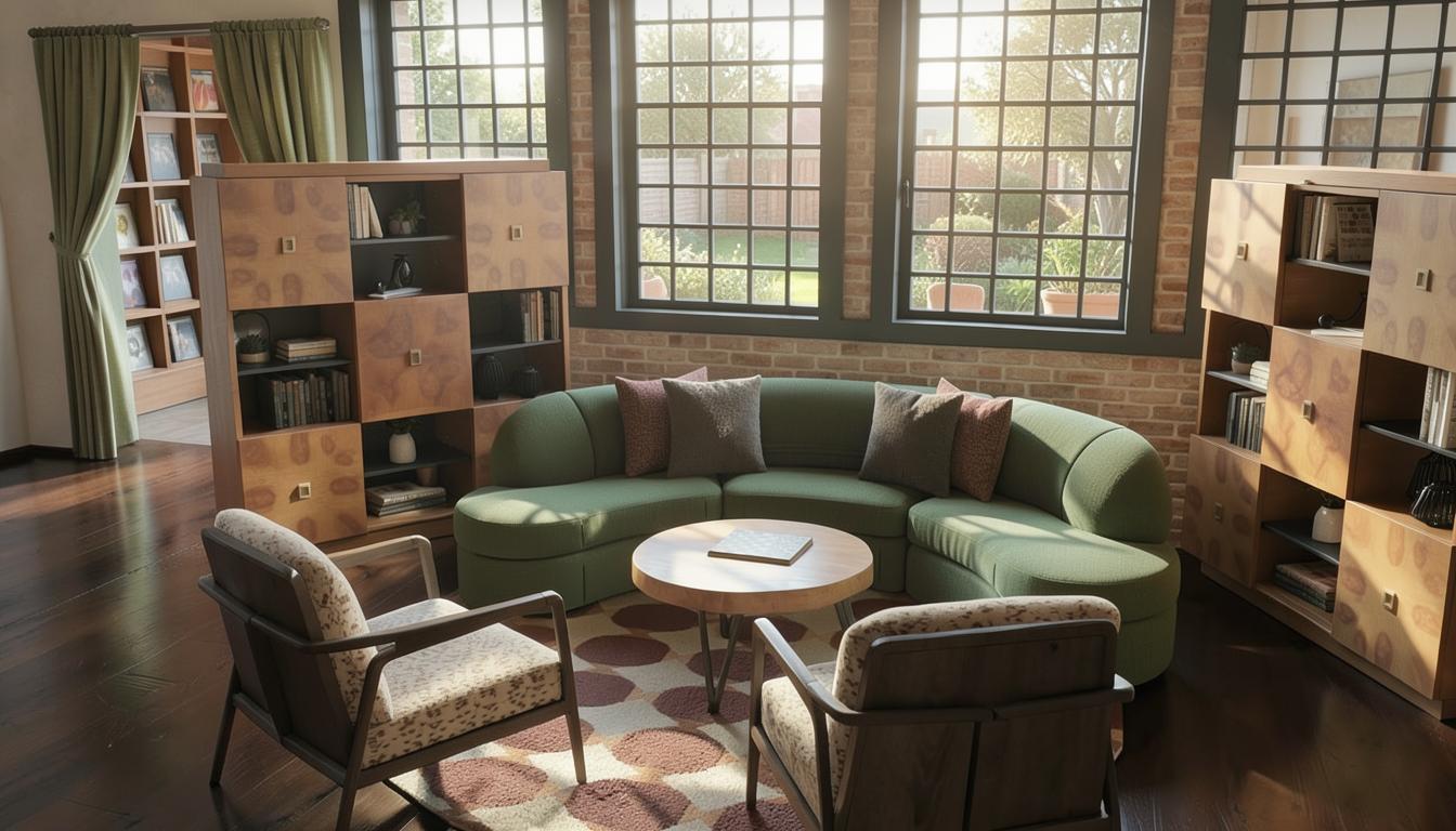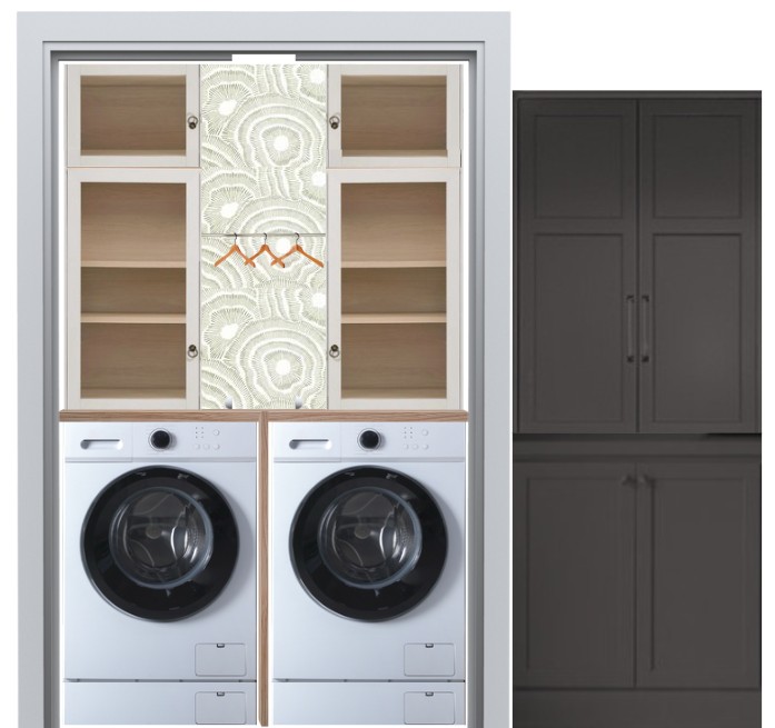 render this concept into a laundry closet with the dark builtin next to the closet show open double doors on the laundry closet with decorative cane detailing on them style the cabinets inside the laundry closet with glass jars for detergent and dryer sheets paint the cabinets above the washer dryer the same color as the dark linen closet but leave the glass on the front of them