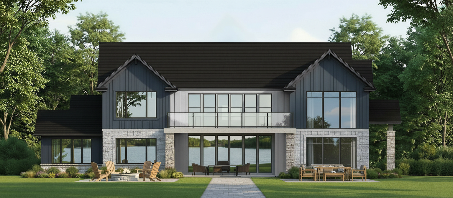 a beautiful two story house in a serene lake setting the roof is covered in dark grey architectural shingles the walls are a soft taupe color the large windows reflect the view of a lake the stone details at the base and around the entrance are in earthy tones of light brown grey and beige lush green trees surround the house adding a touch of nature the atmosphere is peaceful and inviting with a golden hour glow illuminating the scene