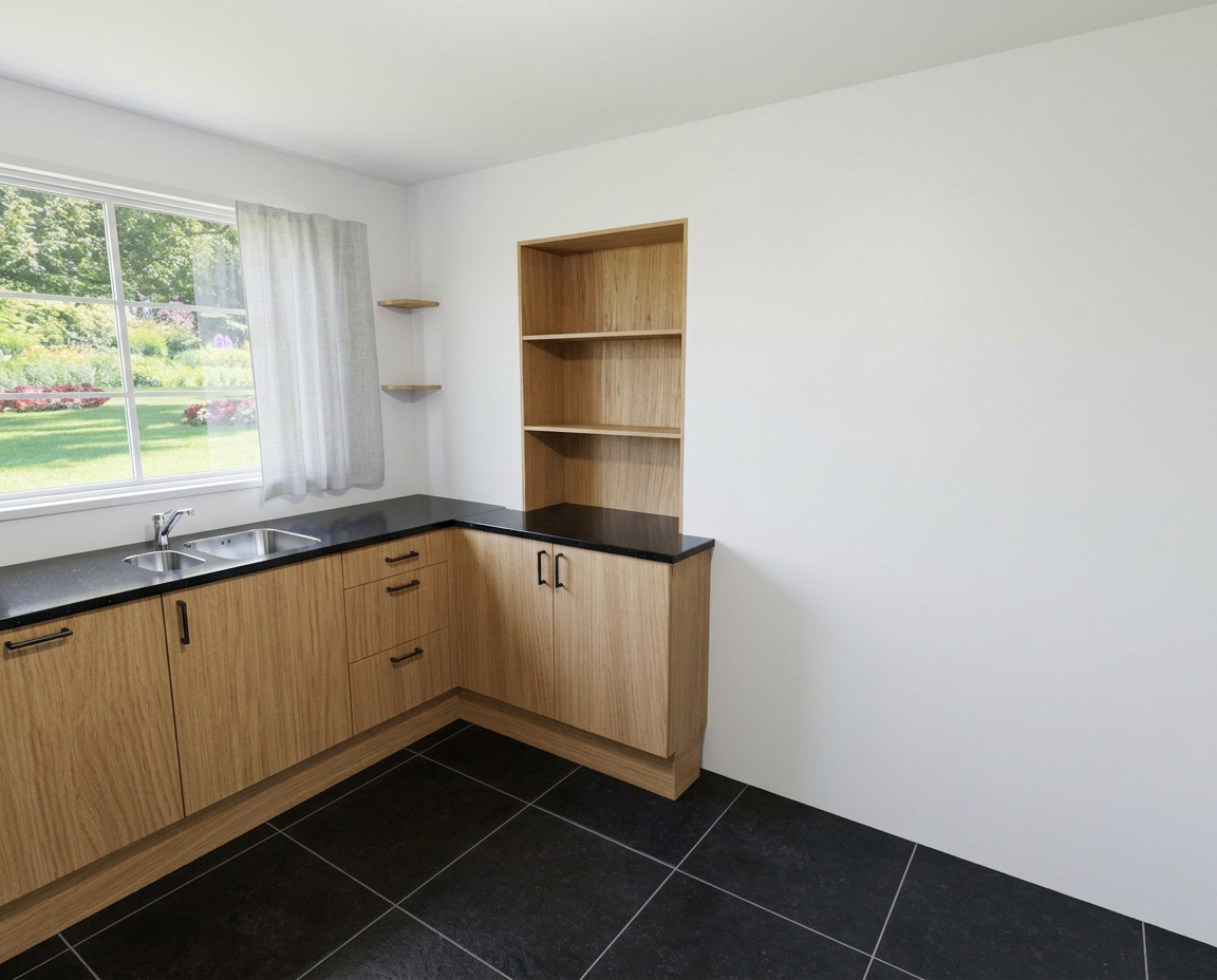 tv wall with lower fcabinets in light oak and some wall shelfs