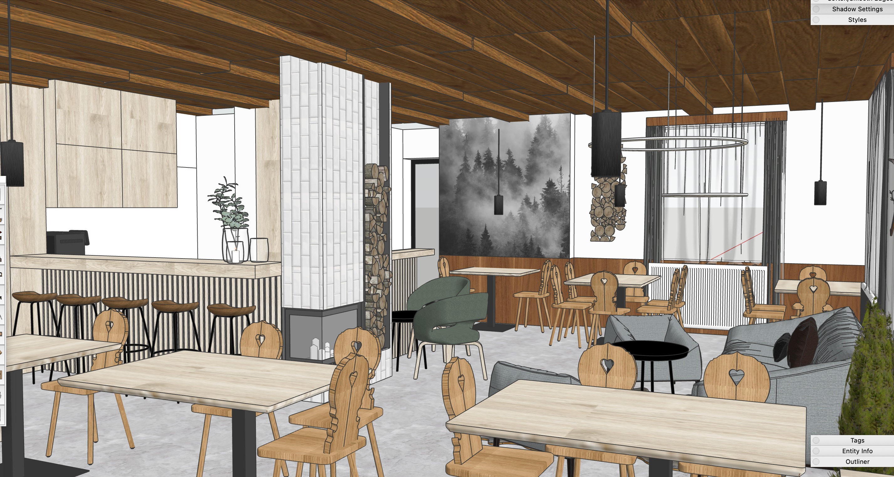 rustic cozy cafe interior with a warm and inviting atmosphere the ceiling and cabinetry feature rich walnut tones complemented by a sleek light wood bar top black pendant lights provide contrast the walls are adorned with a monochrome misty forest mural adding a serene touch tables and chairs are crafted from light oak with a natural finish highlighting heart shaped backrests for a quaint look cushions on a plush gray sofa add comfort while green upholstered armchairs bring a splash of color red and white gingham curtains frame large windows allowing light to pour in the floor is a neutral gray stone enhancing the earthy aesthetic include decorative vases with eucalyptus and stacked wood for a natural touch