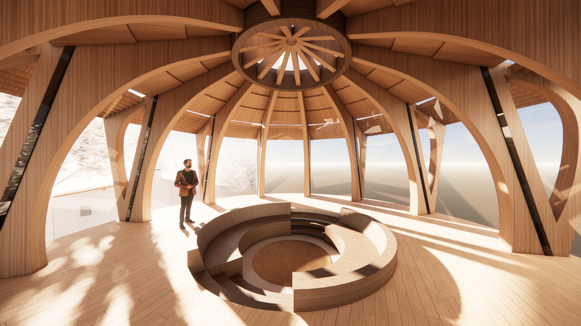 enhance this image without changing the architecture add enhance the wood ceiling detailing to add a ribbed wood veiling treatment in between the structural members kind of like the understide of a mushroom