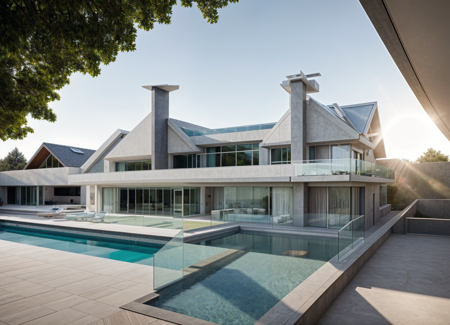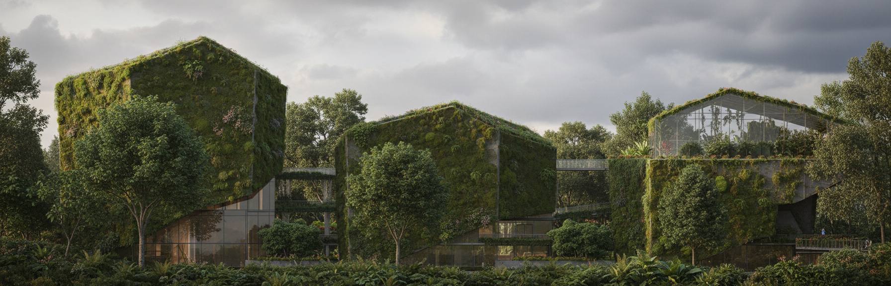 render a contemporary architectural scene featuring three geometrically distinct buildings the buildings should be painted in a mix of soft whites and light greys accented by reflective glass surfaces that catch the sunlight include lush green trees around the buildings and embed a rooftop garden with vibrant greenery on the right building the sky above should be a bright and clear blue evoking a fresh open atmosphere add subtle shadows to give depth and dimension to the structures enhancing their modern aesthetic